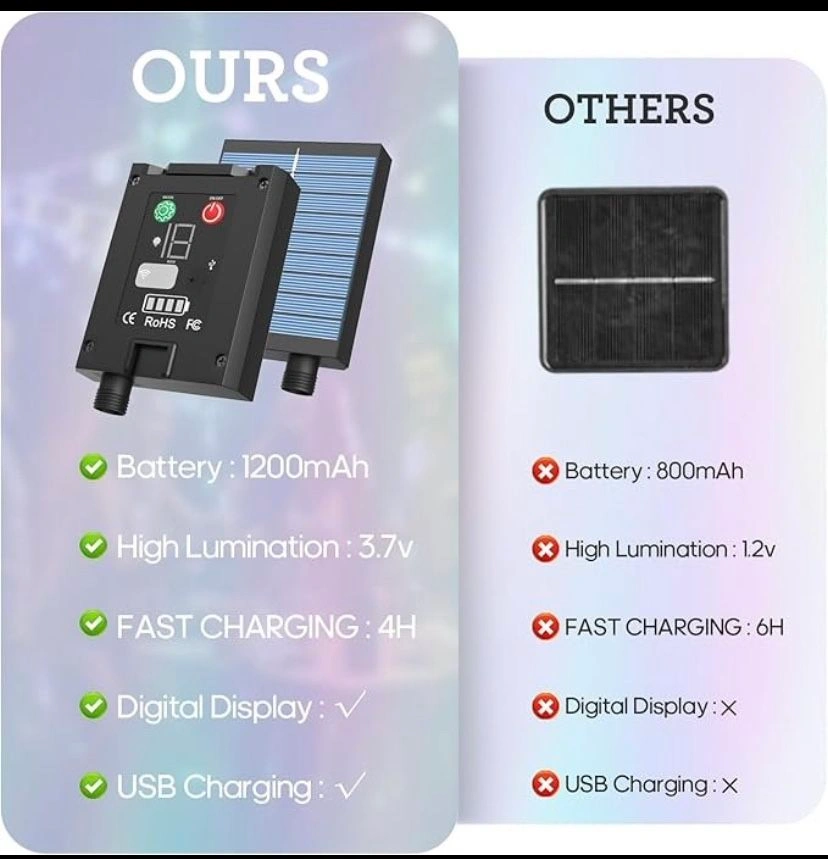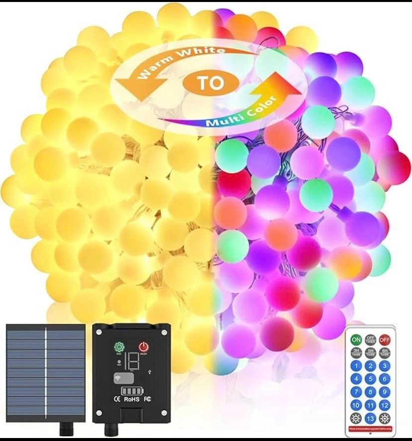 As is, New! Solar Globe String Lights Eco-Friendly: High-quality solar panels charge in 4 hours for 6-7 hours of illumination. No plug needed for energy savings. Durable & Safe: IP67 waterproof with a double-sleeve design and polypropylene bulb shell to protect against breakage. Upgraded Panel: 4.5V/250mAh solar panel with Type-C charge (USB cable not included), 300% faster charging, and brighter lights. Features dual controls and a digital screen for charging status. Timer & Memory: Includes 3 timing modes (3H/5H/8H) and a memory chip to save your last lighting mode. Versatile Lighting: 13 lighting modes and 4 brightness levels controlled via solar panel or remote for a customizable ambiance.