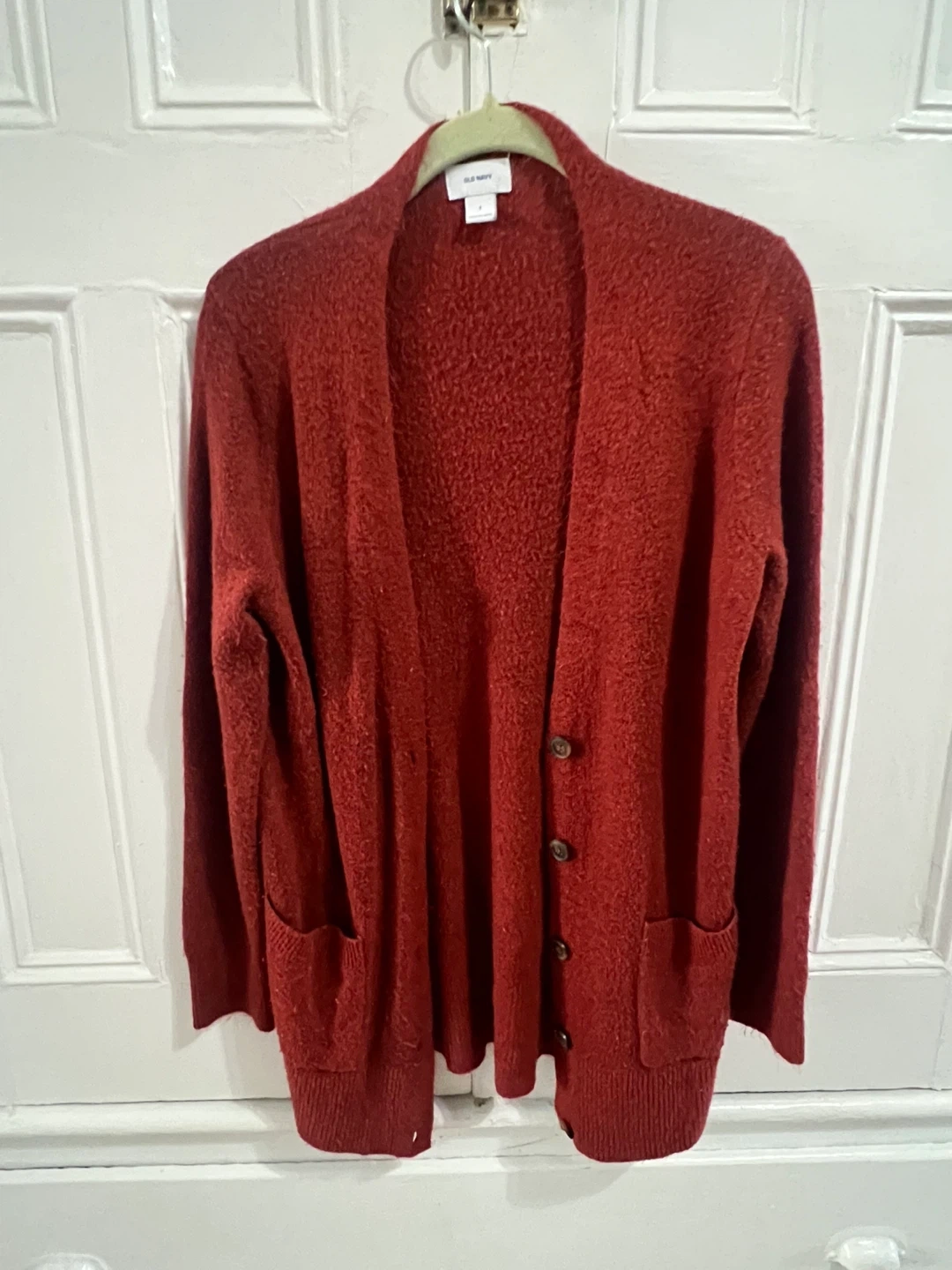 564Selling a super soft and cozy Old Navy cardigan in a lovely orangish reddish-brown rust color! It's a size small (but stretchy) and features a button-up front and two handy pockets. Perfect for layering this fall!