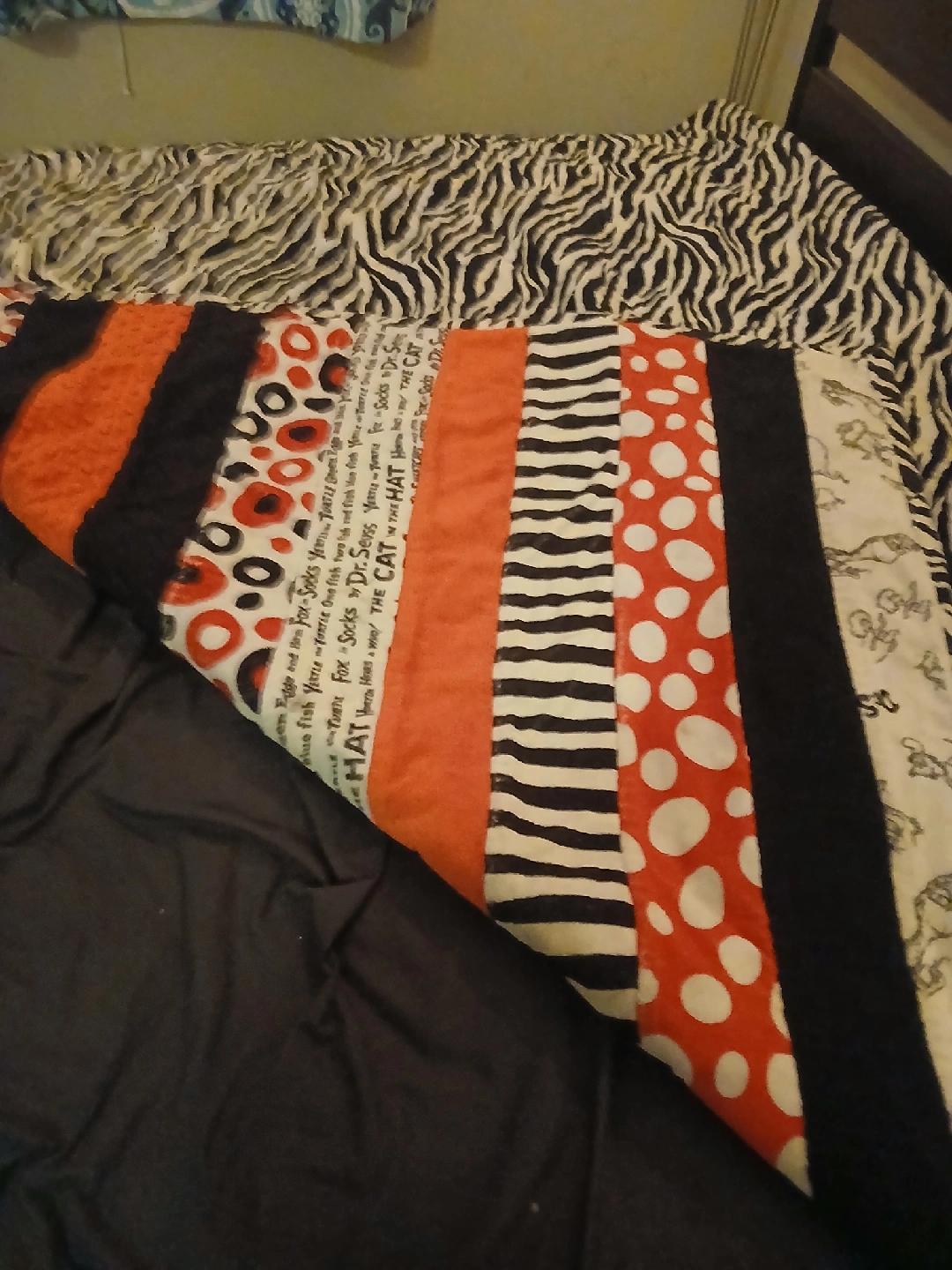 A fun animal print on one side and Dr Seuss quotes and colored stripes on the other side.