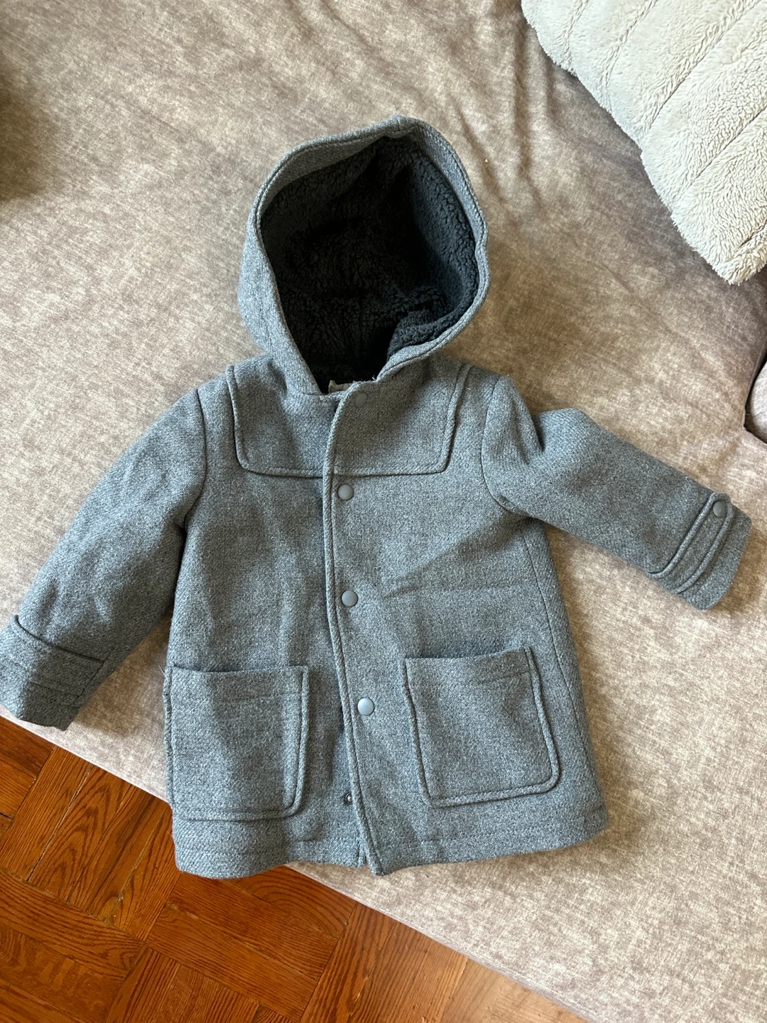 Selling a Zara Kids grey hooded coat in excellent condition! The size is 2-3 years (98 cm). It's made in Morocco and perfect for keeping your little one warm and stylish.