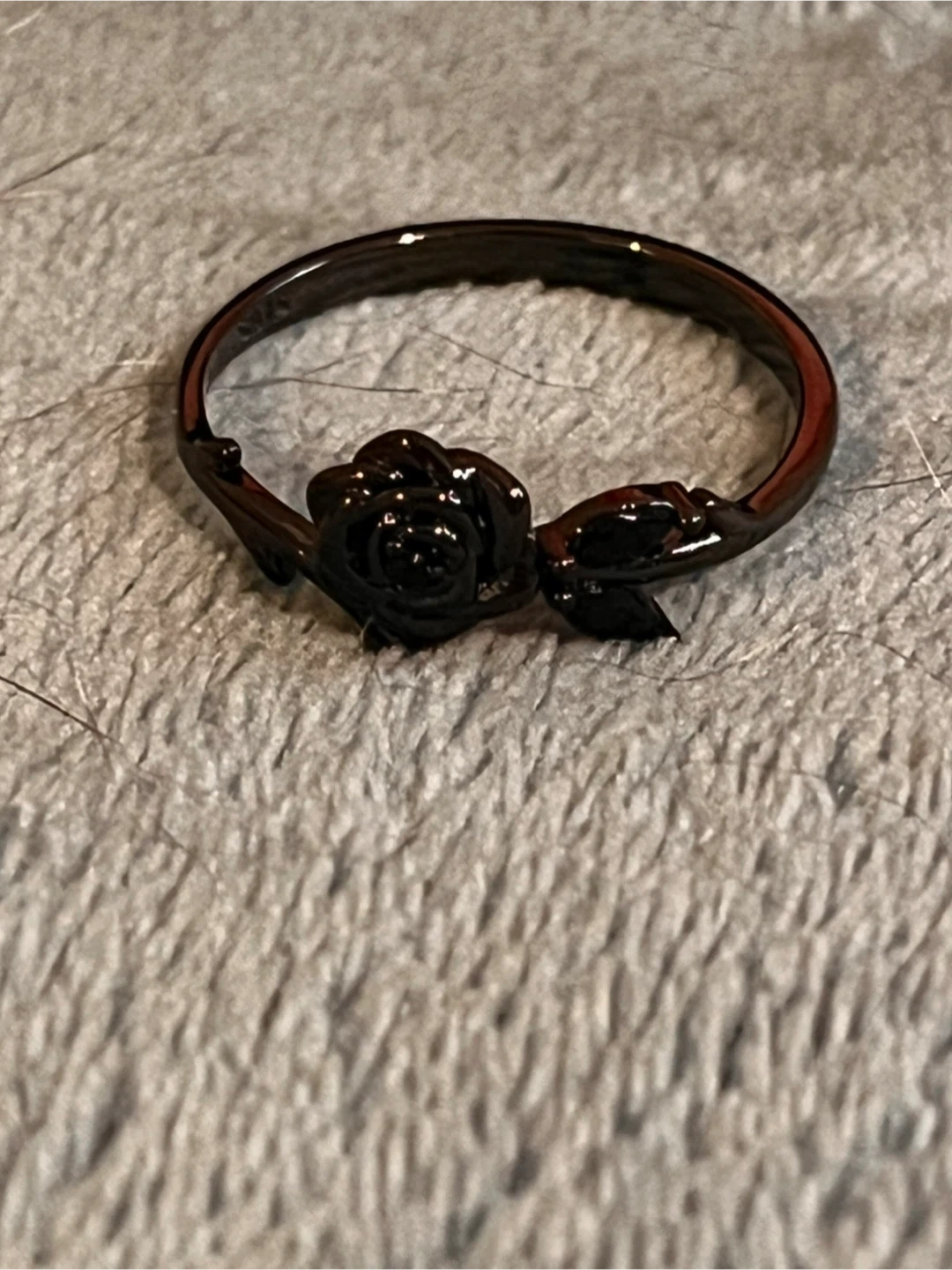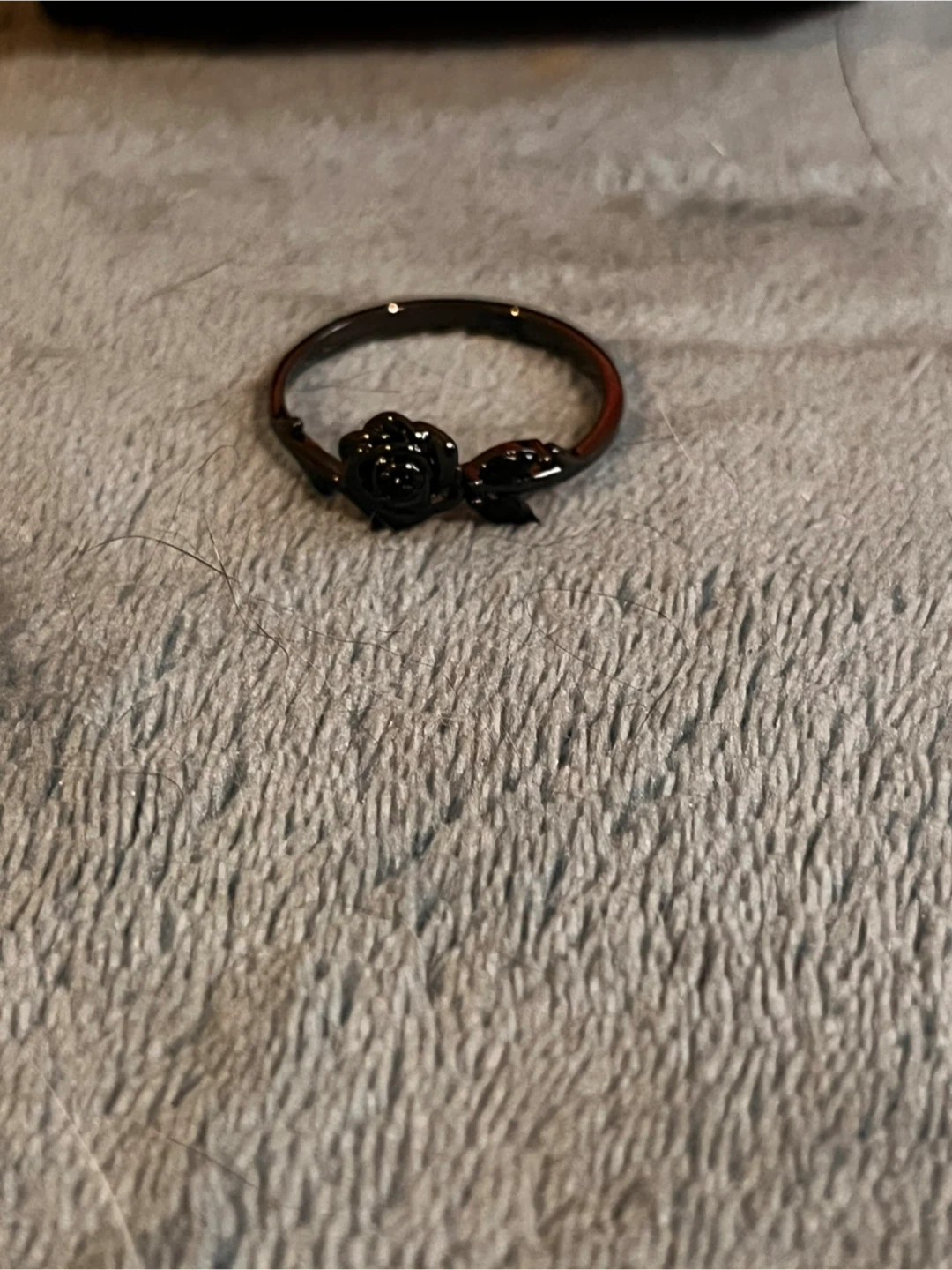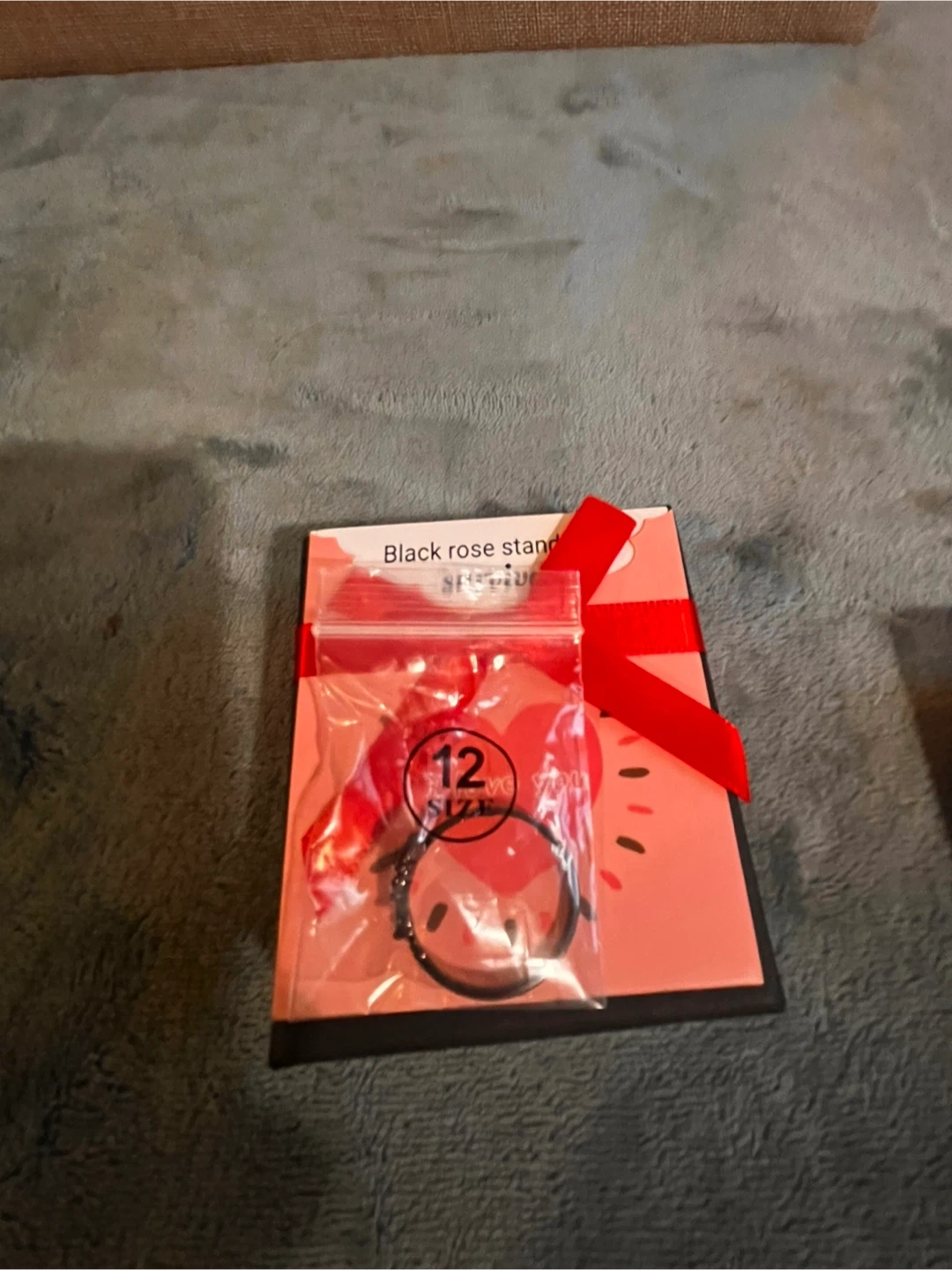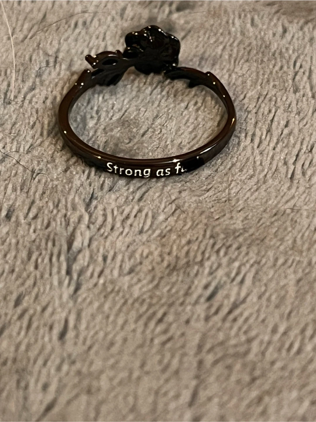 Selling a beautiful black rose ring, size 12! It comes in its original packaging, which is adorned with a cute red ribbon and heart design. The ring itself has a delicate rose detail and the words 'Strong as f...' engraved on the inside. Perfect as a gift!
