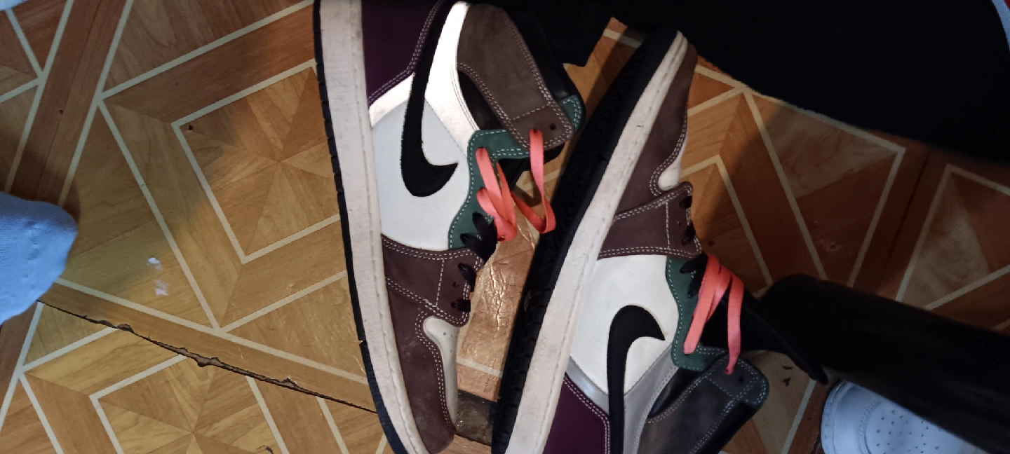 Selling a pair of Nike Air Jordan 1 High OG sneakers. They feature a mix of brown, white, green, and purple colors. The shoes have black Nike swooshes and orange laces. Please take a look at the pictures for the condition!