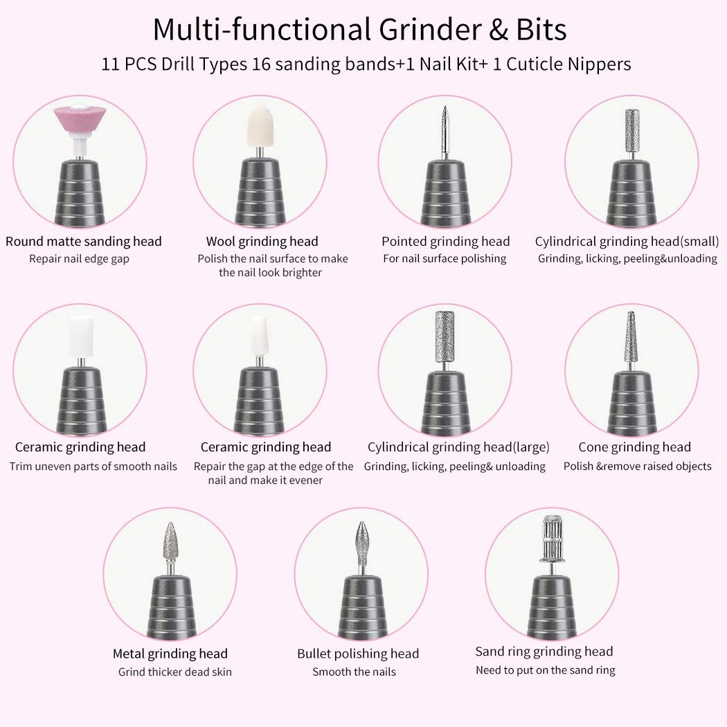 76FunPa Electric Nail Drill,Portable Electric Nail Drill, With 11 Pieces Changeable Drills And 10 Sand Bands for Acrylic, Gel Nails, Nail Salon and DIY Manicure. (Gray)