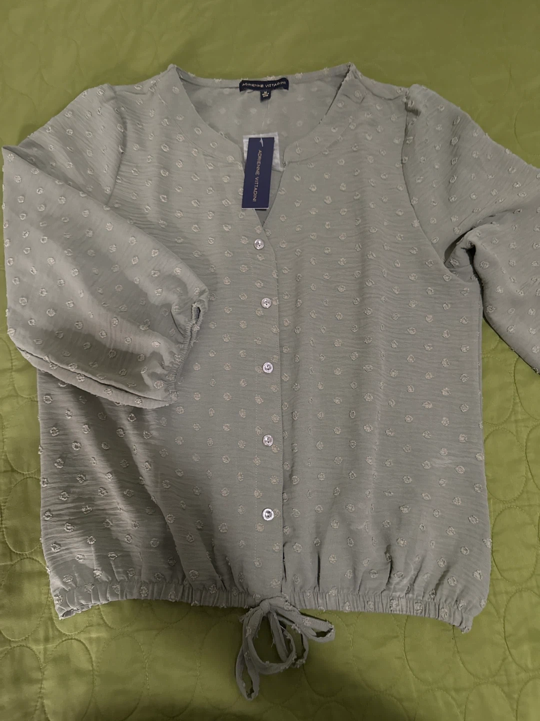 Selling a brand new with tags Adrienne Vittadini button-down top. It's a lovely light green color with a subtle textured pattern. Perfect for a casual or dressed-up look!