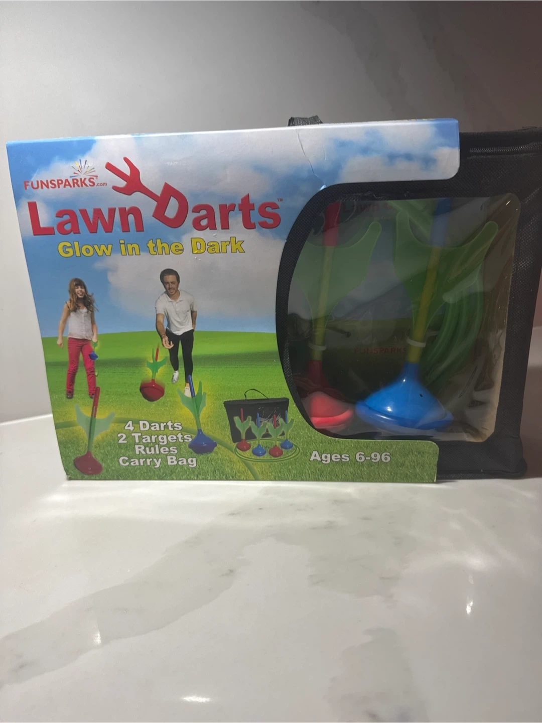 Funsparks Lawn Darts game, glow in the dark version! This set includes 4 darts, 2 targets, the rules, and a carry bag. Recommended for ages 6-96