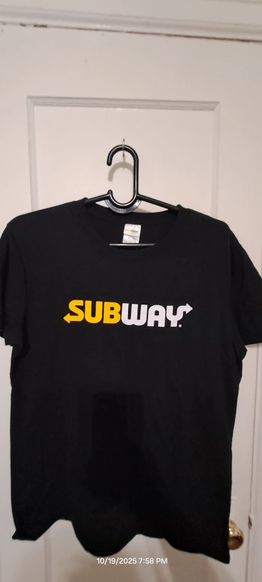 65Selling a black Subway t-shirt in size L. It's in great condition and features the Subway logo. Perfect for any Subway fan!