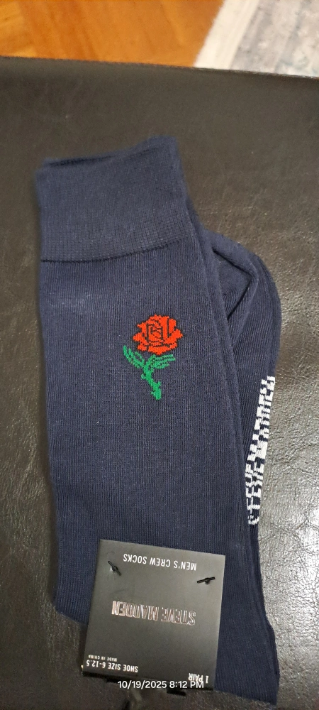 65Here are some Steve Madden men's crew socks. They fit shoe sizes 6 to 12.5. They are a nice dark blue color with a rose on them..I have 6 pairs..thanks everyone..with tags..sold separately