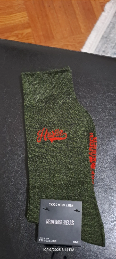 65Selling a pair of Steve Madden men's crew socks. They fit shoe sizes 6 to 12.5. The socks are green with red accents and have the Steve Madden logo and HUSTLE logo...have 6 pairs thanks everyone..with tags..sold separately