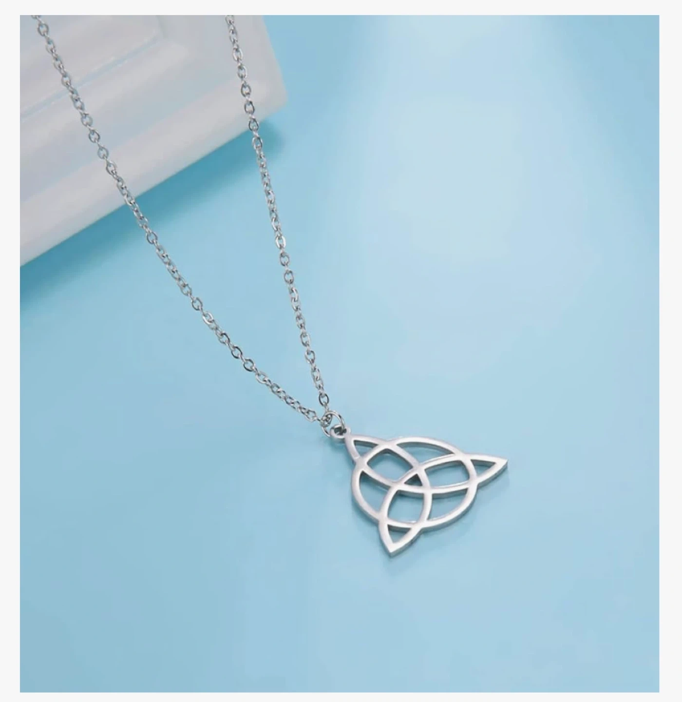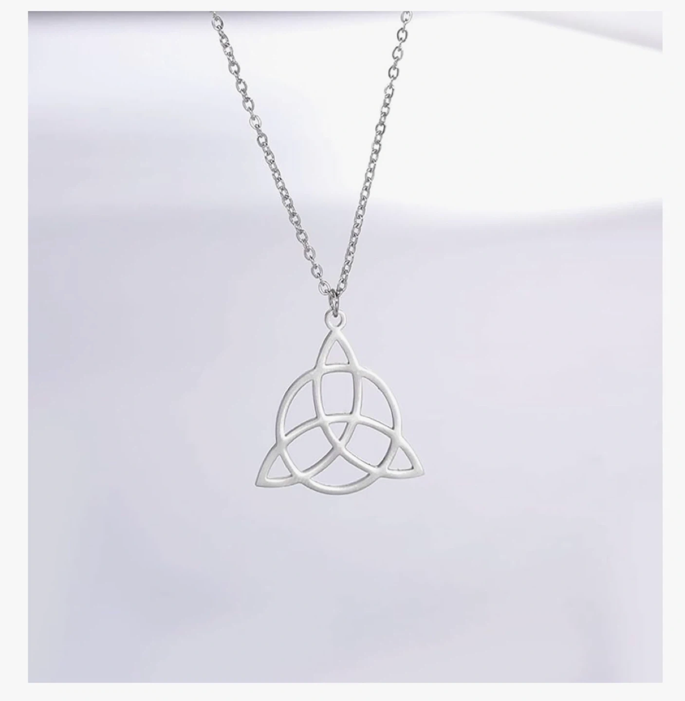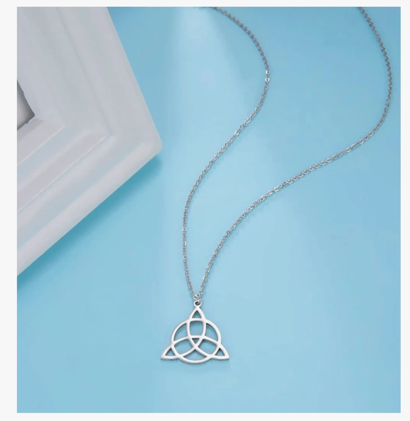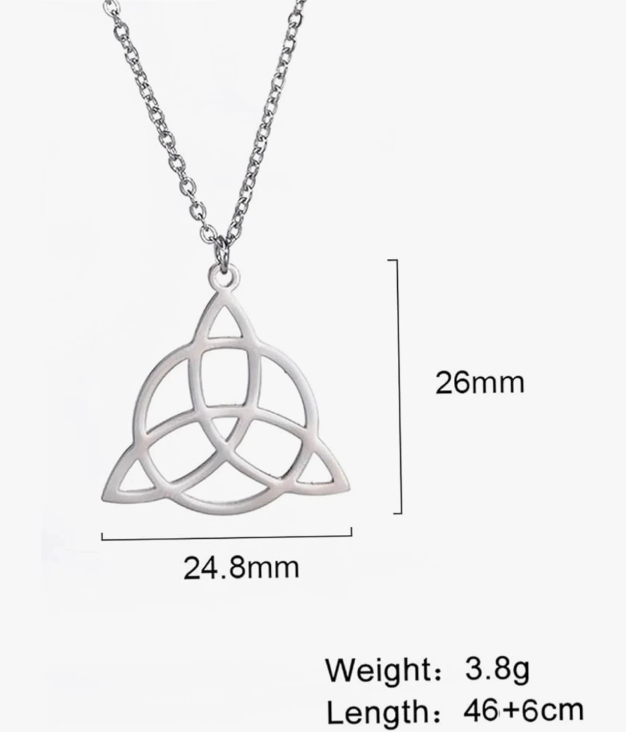 121This is a silver-colored pendant necklace featuring a Trinity Knot design. The pendant measures approximately 26mm in height and 24.8mm in width. The necklace length is 46+6cm and the weight is 3.8g