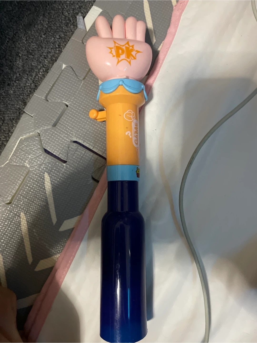 519This is a fun bubble blower wand shaped like a hand. It has a 'PK' logo on the hand part. The wand is a combination of colors: pink, orange, and blue. It looks like a fun toy for kids and using as Halloween Witch Item