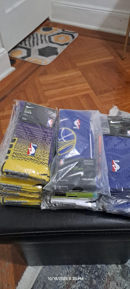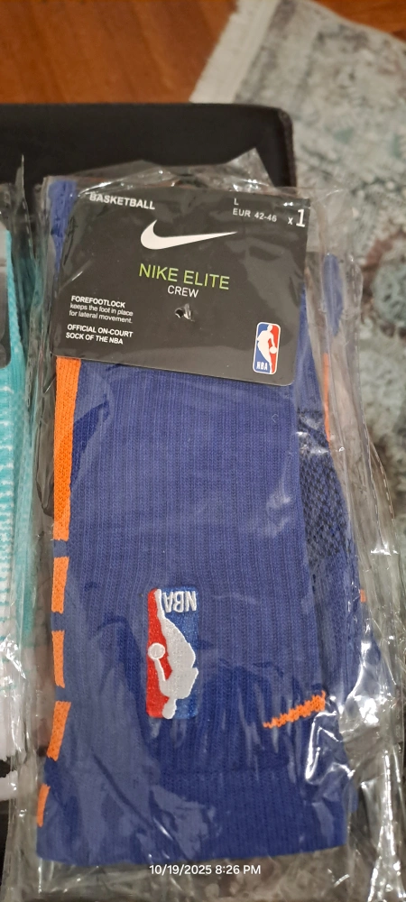 65Selling a pair of Nike Elite Crew NBA socks in size L. They are a cool blue color with orange accents and the NBA logo. These socks are made of 55% polyester, 41% nylon, 3% cotton, and 1% spandex. They're designed for basketball and feature ventilation to keep your feet cool and cushioning for support..new with tags..HAVE 14th pairs few different colors...thanks everyone..being sold separately