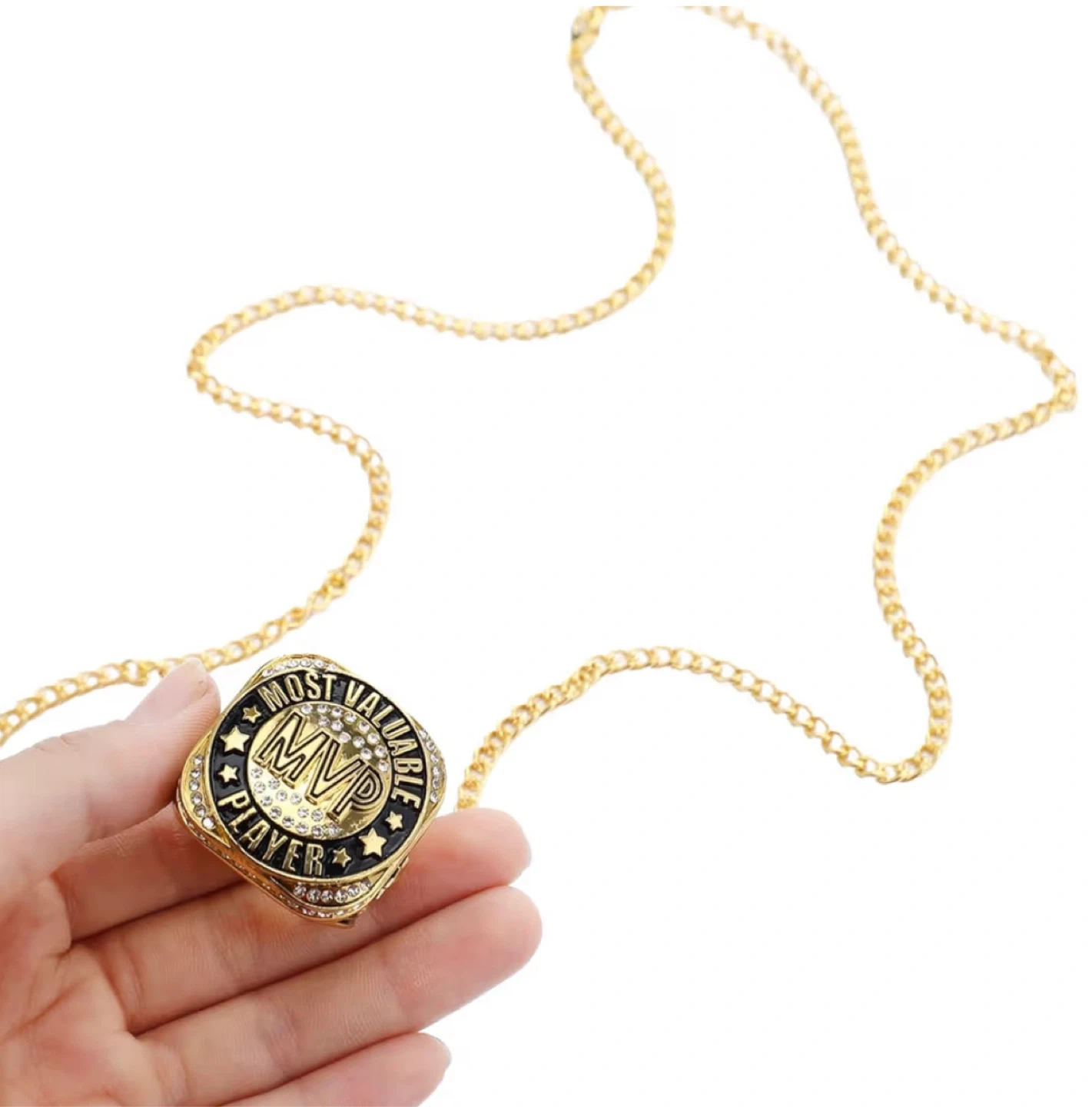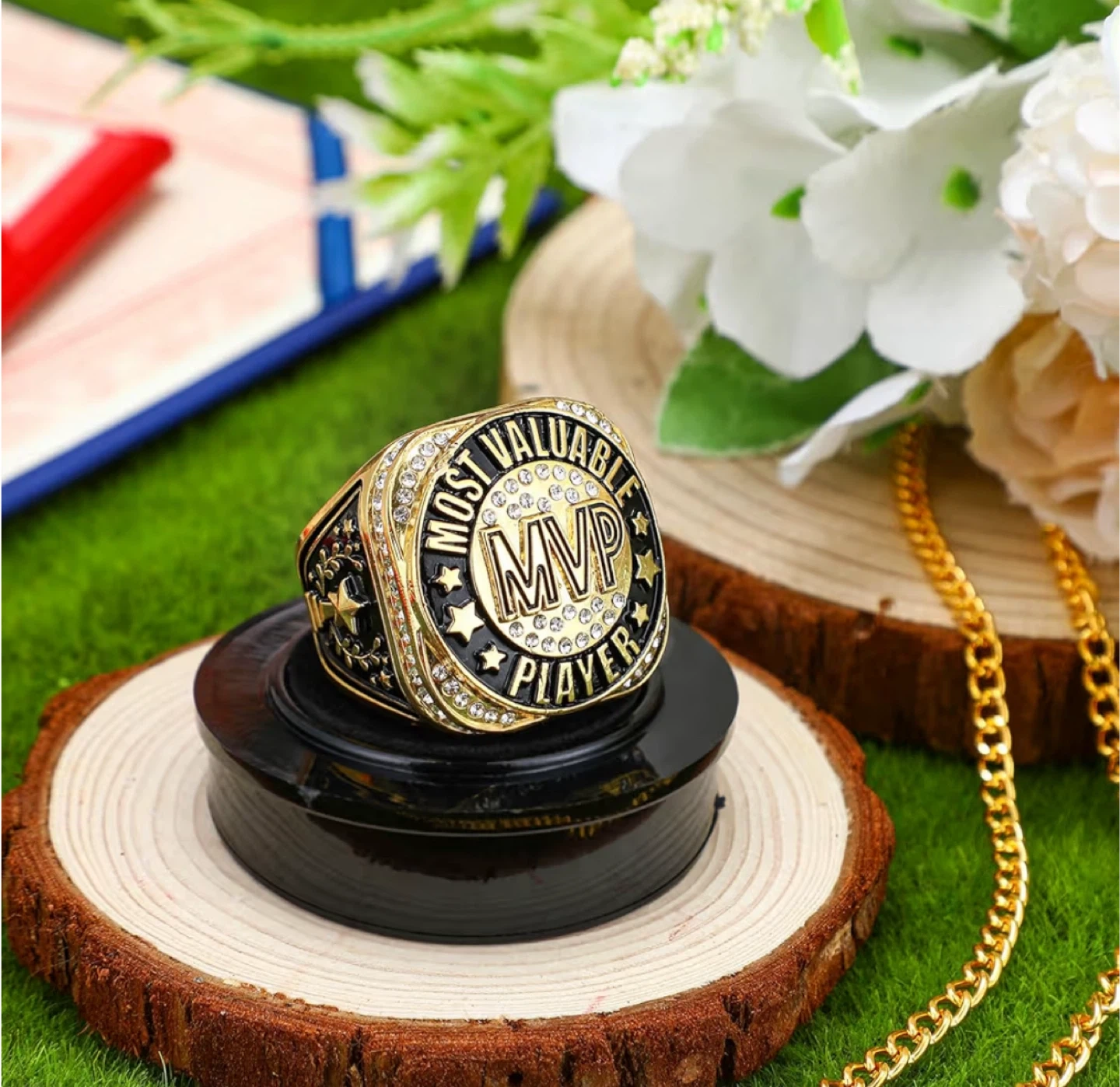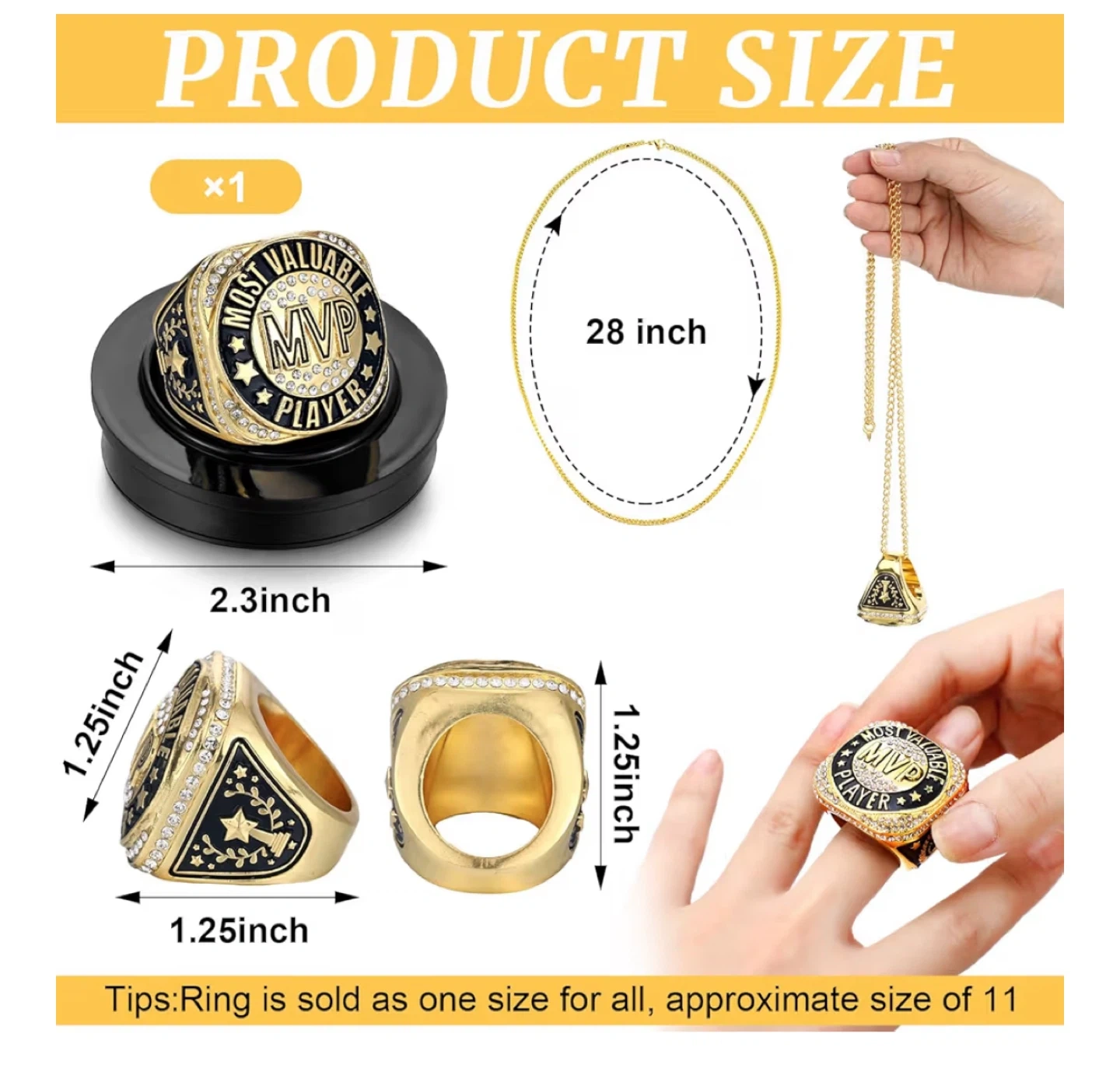 121Selling a new MVP Championship ring! It's a size 11 and comes with a display neck chain and a black display stand. The ring is made with high-quality material. The chain is 28 inches long, and the ring dimensions are approximately 2.3 inches in length and 1.25 inches in width and height