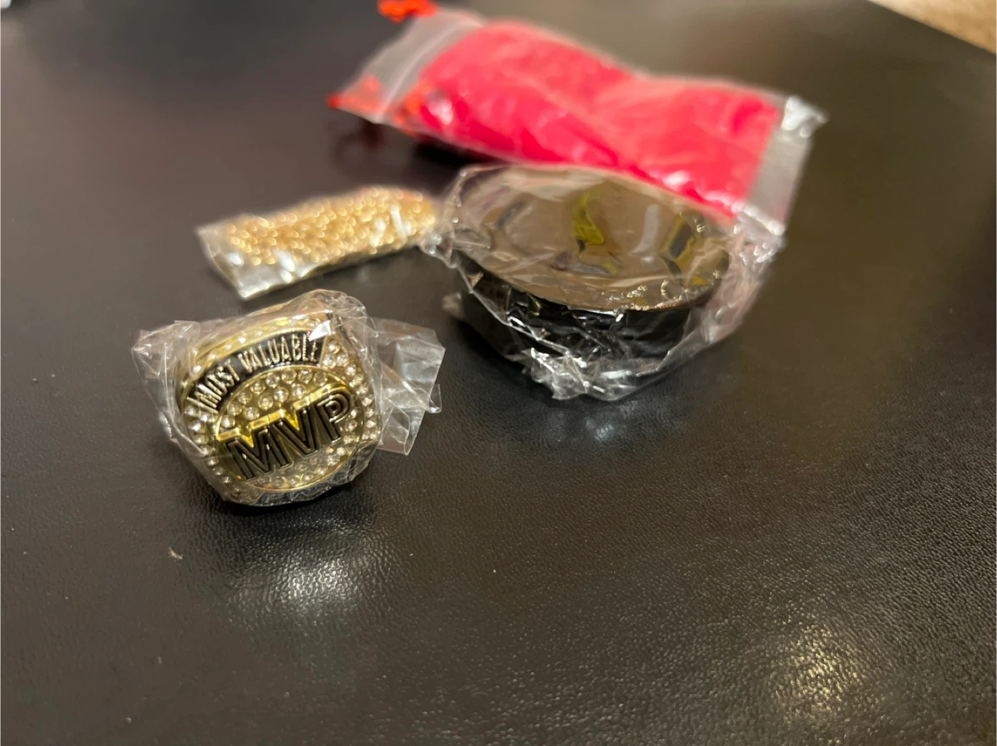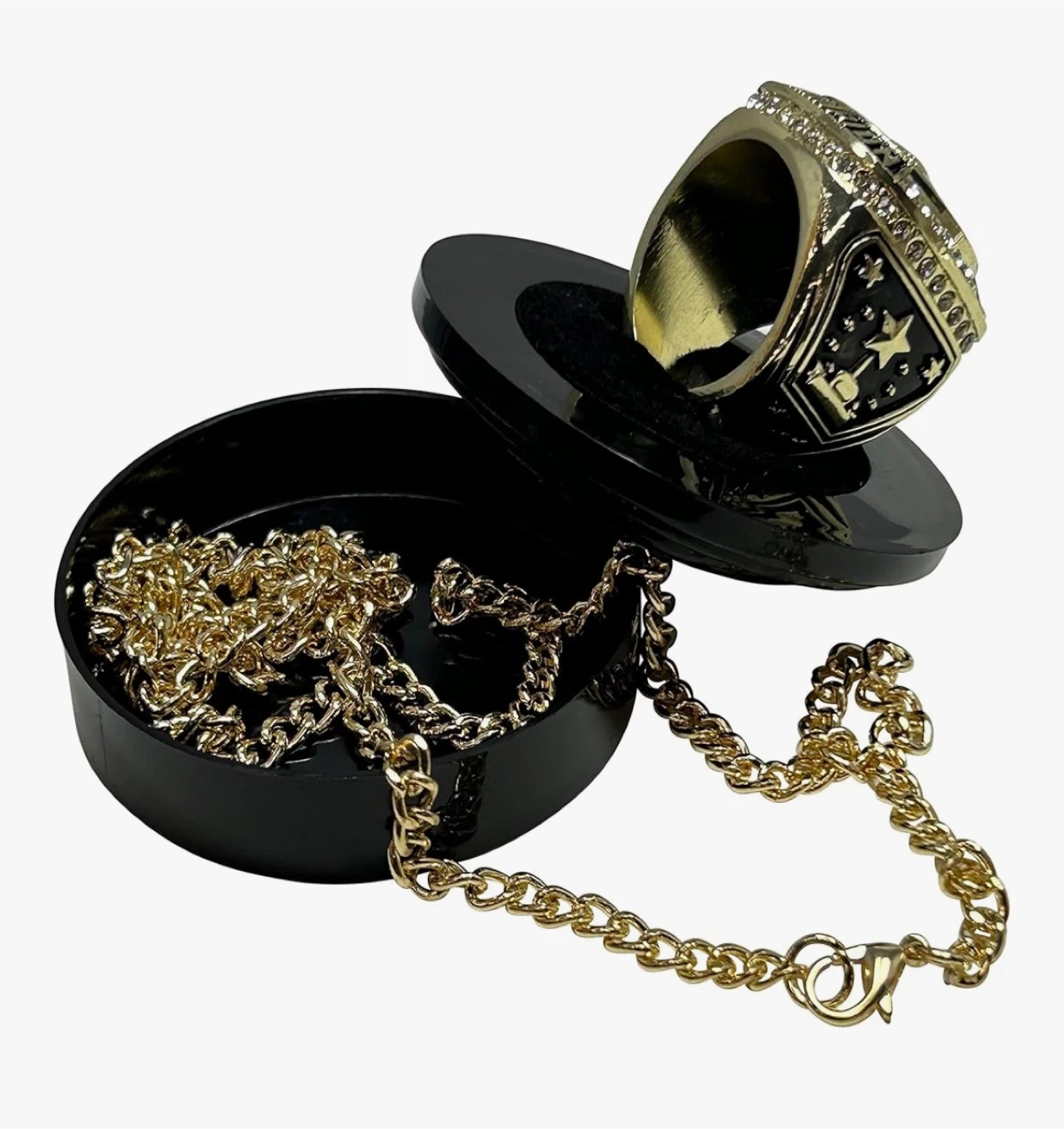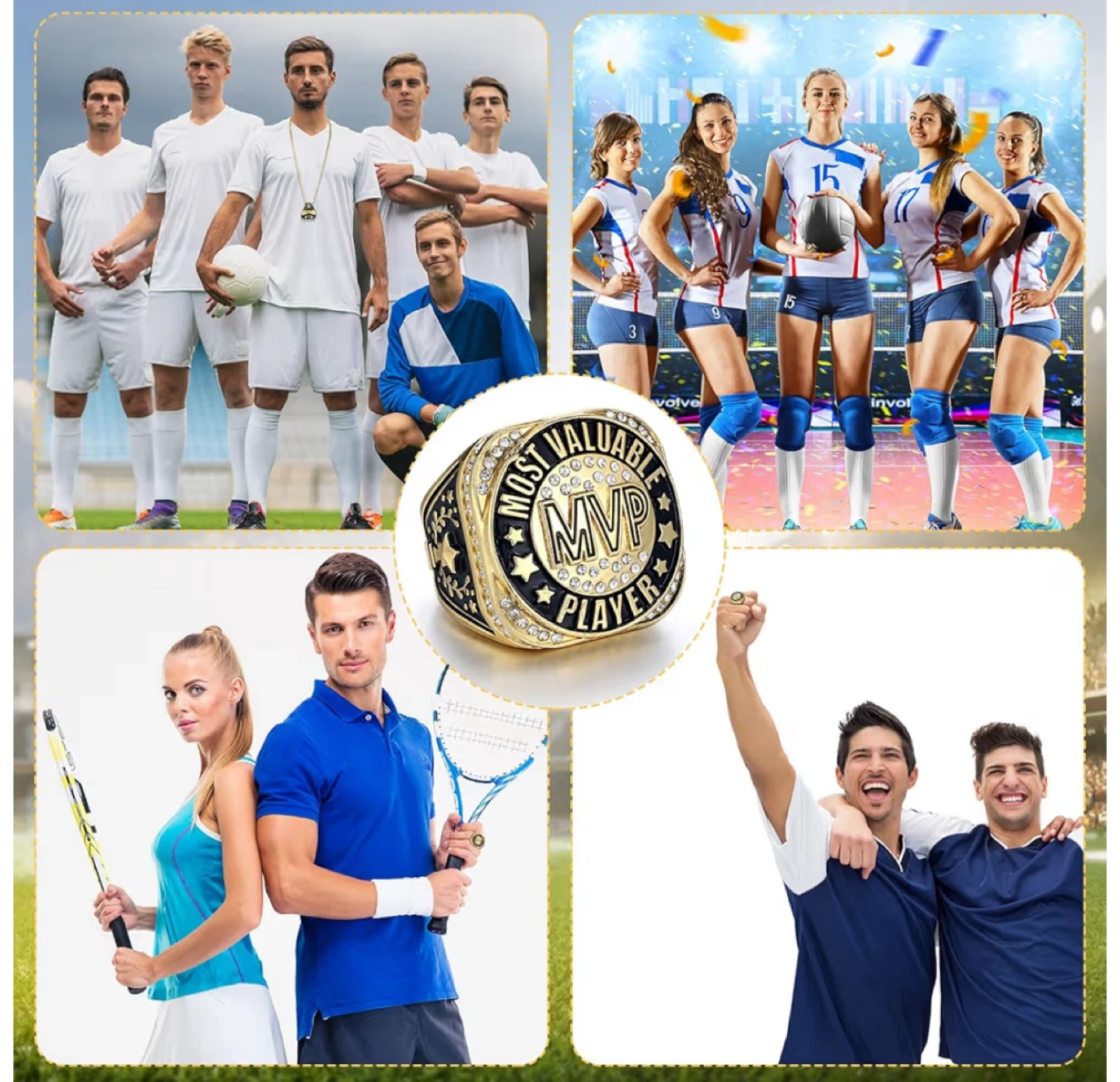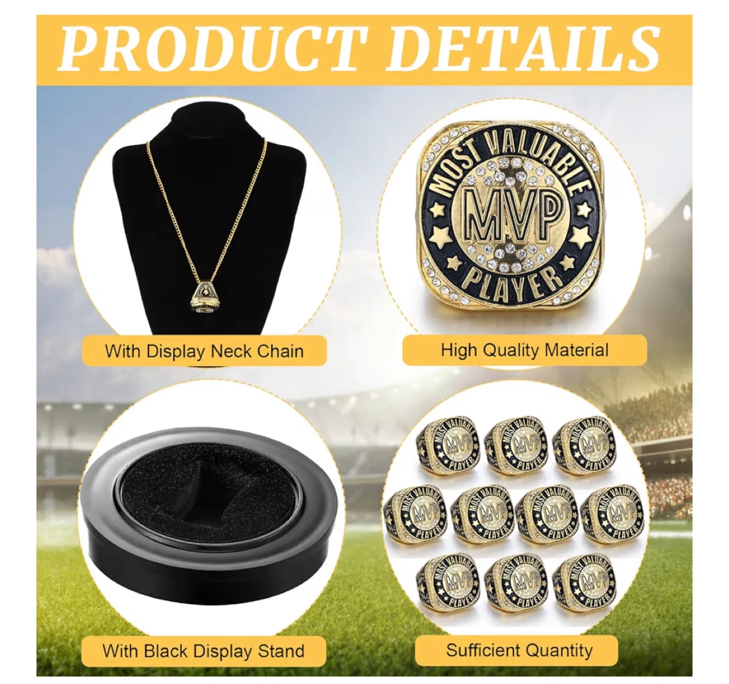 121Selling a new MVP Championship ring! It's a size 11 and comes with a display neck chain and a black display stand. The ring is made with high-quality material. The chain is 28 inches long, and the ring dimensions are approximately 2.3 inches in length and 1.25 inches in width and height