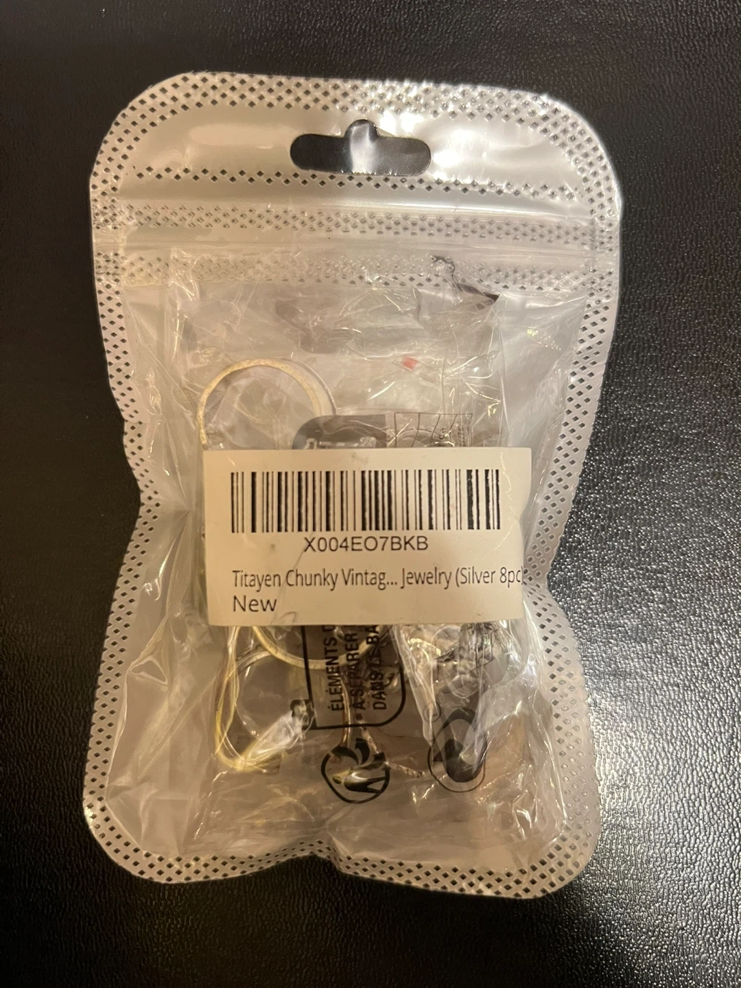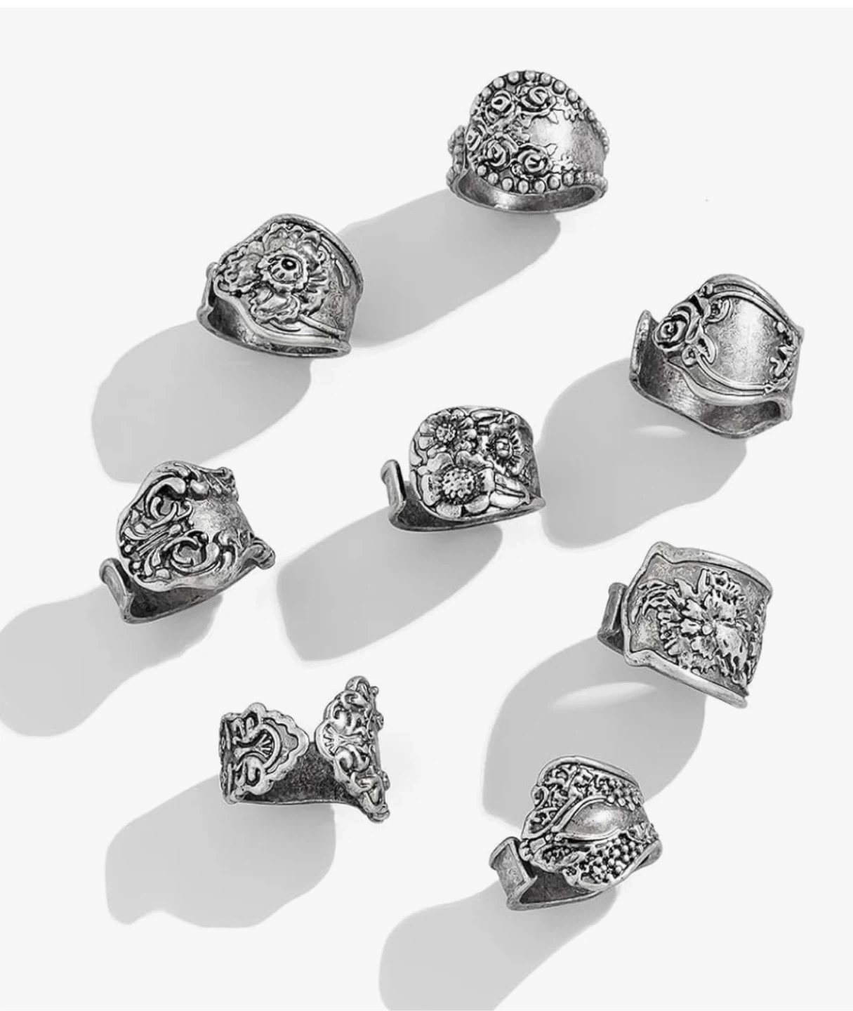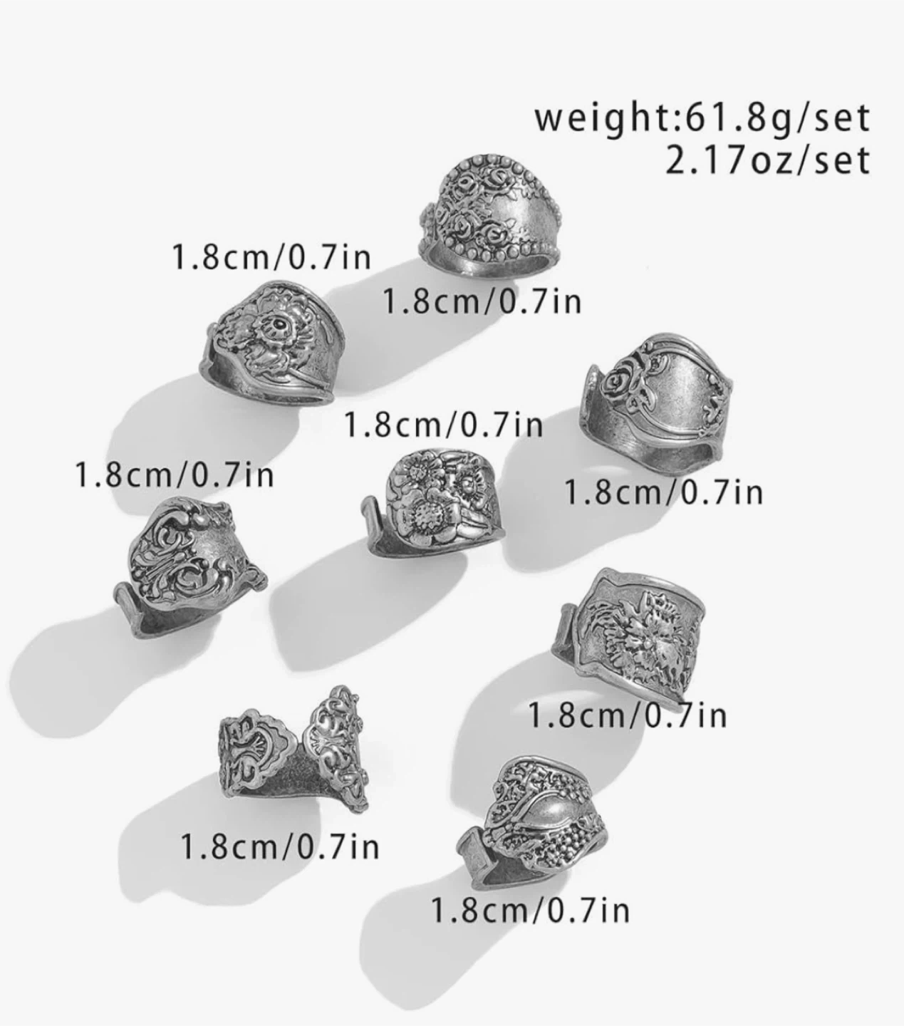 121Selling a set of Titayen chunky vintage rings. This set includes 8 silver-colored rings in a new condition. Each ring measures approximately 0.7 inches (1.8cm) in diameter and the total weight for the set is 2.17oz (61.8g).