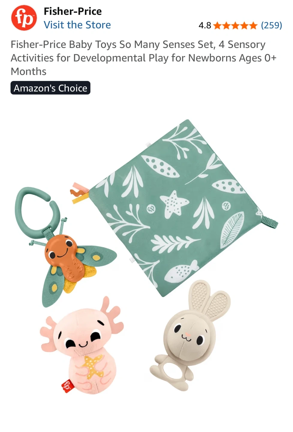 107This is a brand new Fisher-Price So Many Senses Gift Set! It includes 4 sensory activities for developmental play for newborns ages 0+. This set is perfect for stimulating your baby's senses and encouraging early development. Originally bought for $24.99, it's still in its original packaging and ready for a new home!