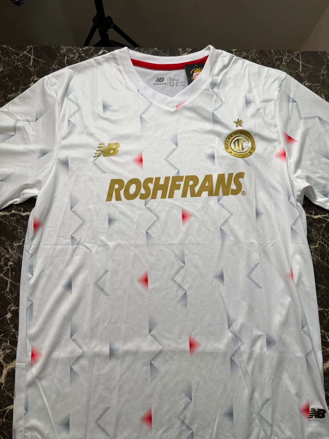 soccer jersey Toluca in size XL. It's white with gold accents and features the logos of Roshfrans, Corona, and Caliente.mx. The shirt is in great condition!