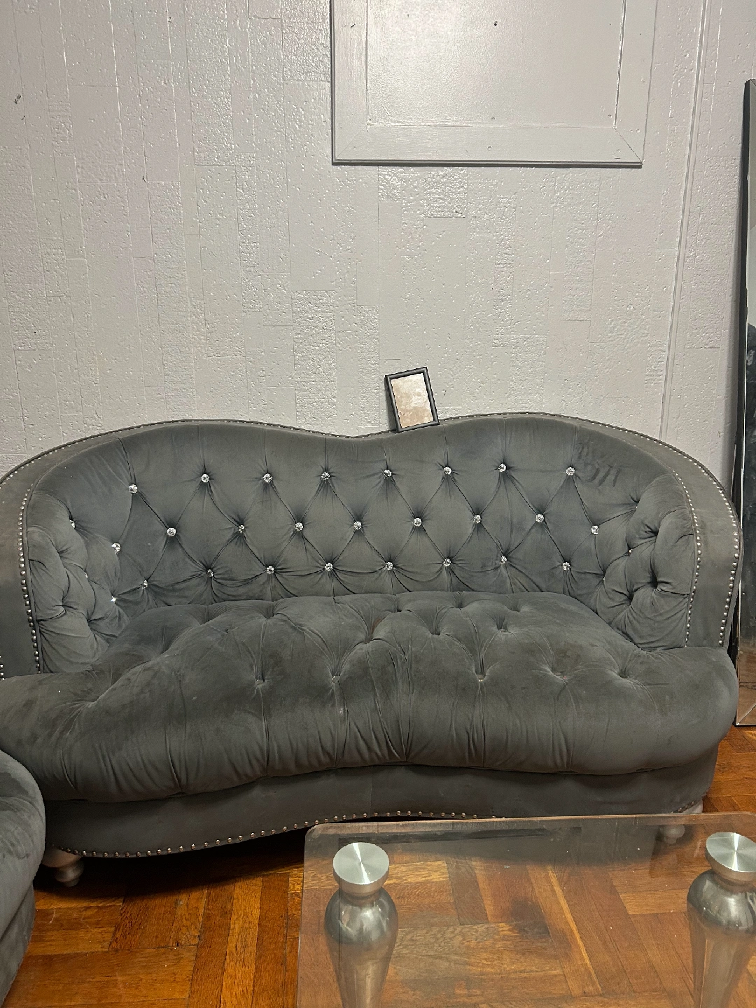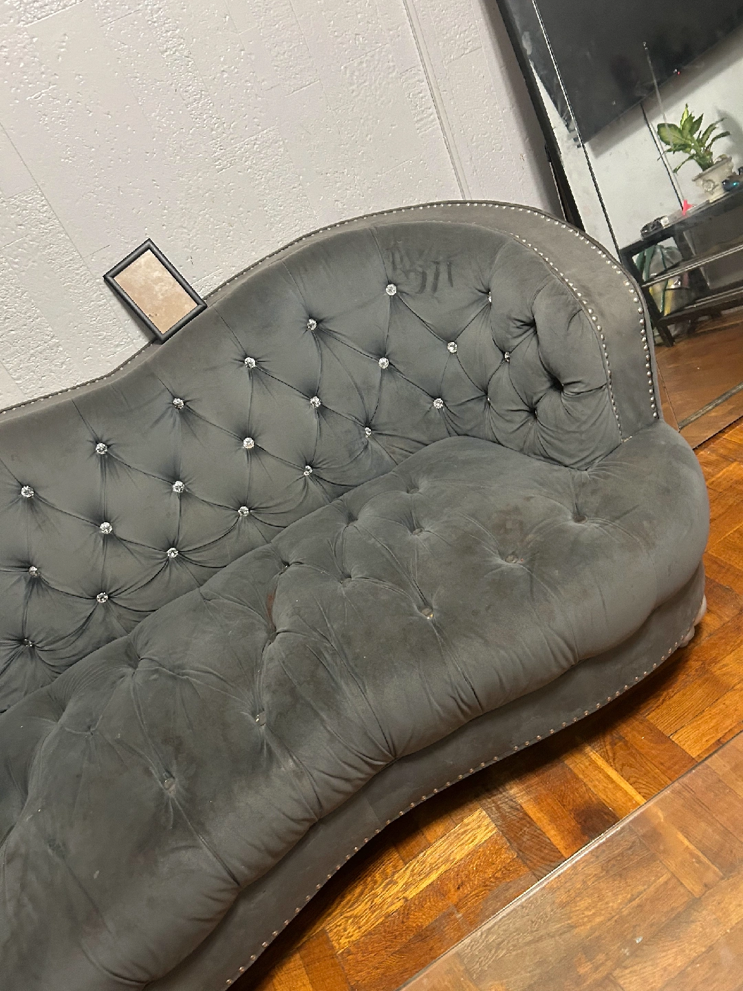 10Selling a gray tufted sofa. It has a unique design with button tufting and nailhead trim. It's a stylish piece that would look great in any living room or lounge area. There are some signs of wear.