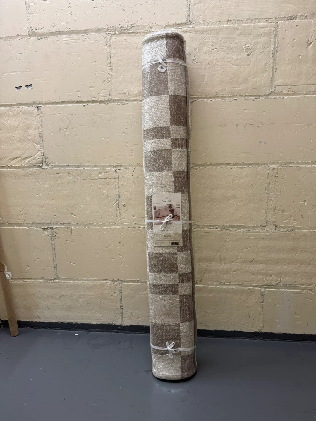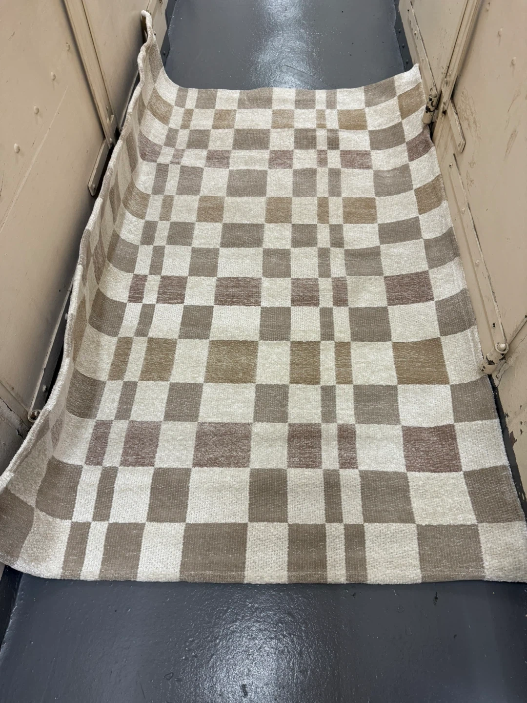 120Selling a nice area rug with a checkered pattern. It is beige and tan. It's in good condition and ready to add some style to your space