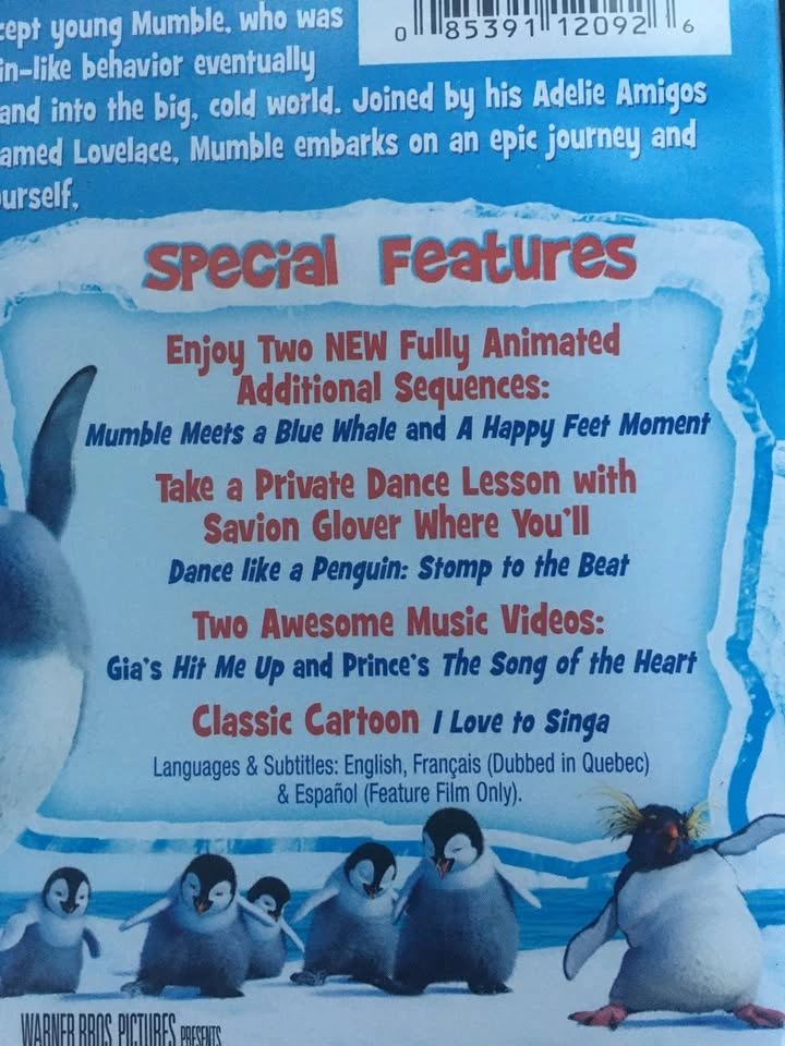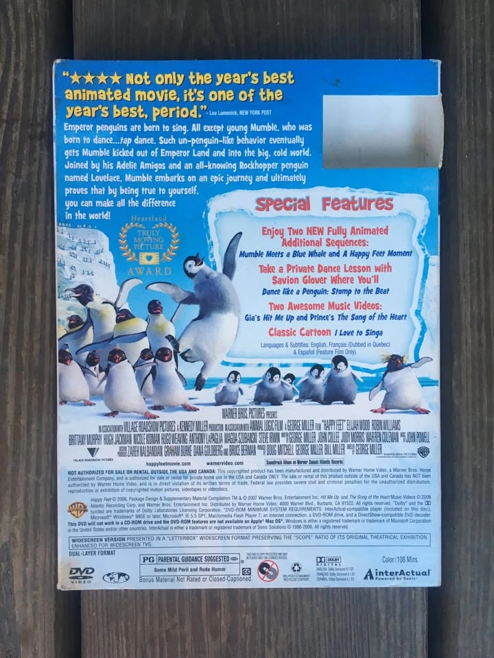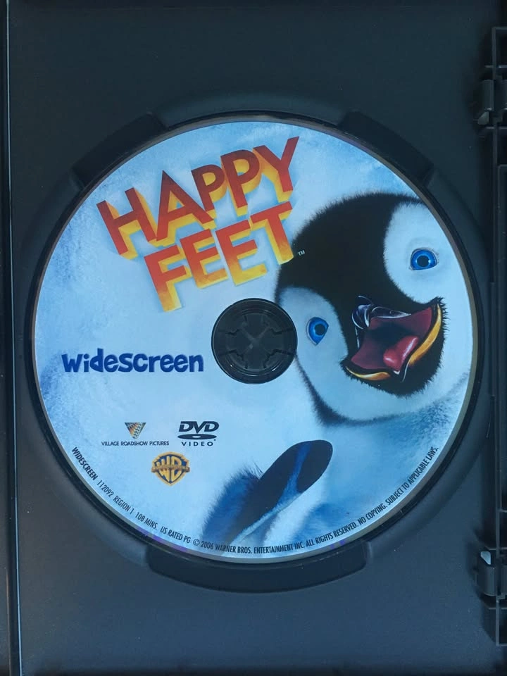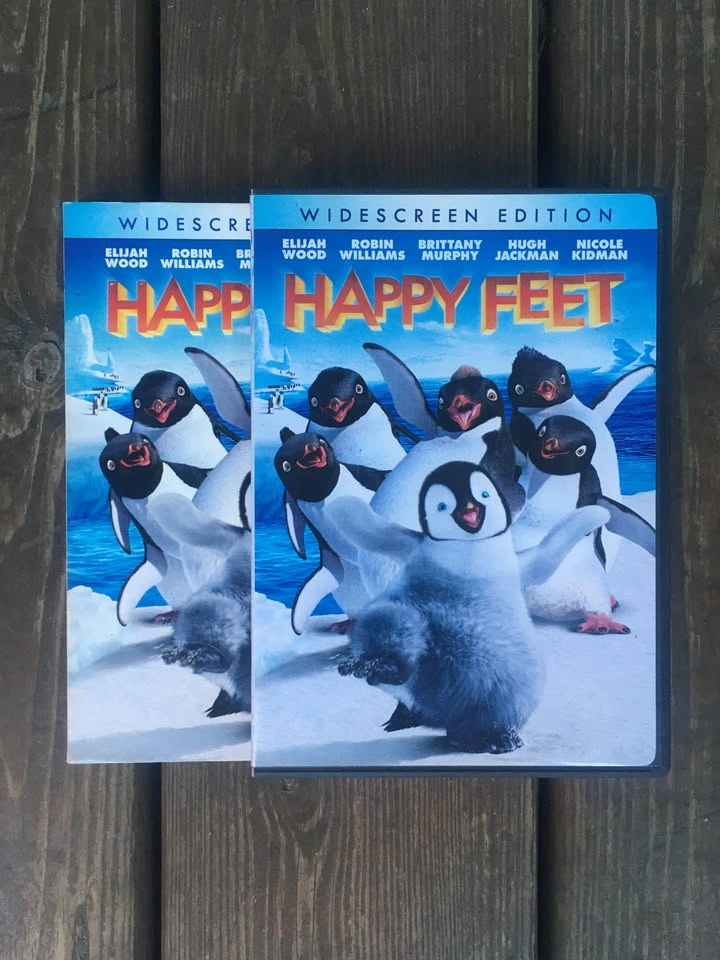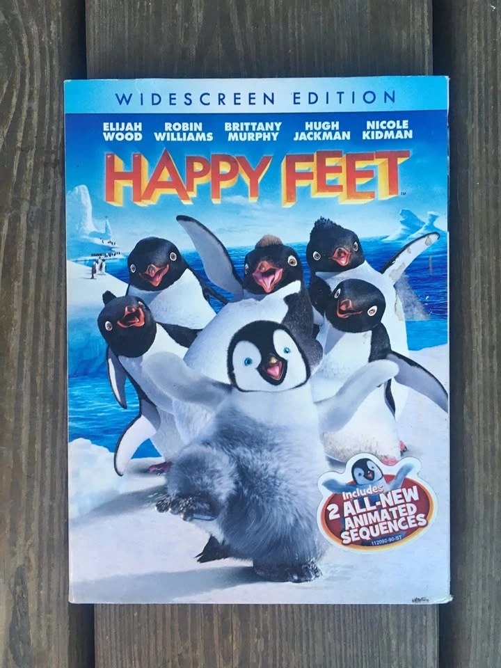 Featuring the voices of Elijah Wood, Robin Williams, Brittany Murphy, Hugh Jackman and Nicole Kidman. Includes 2 All-New animated sequences and 2 music videos. Running time of 108 minutes in Dolby Digital. Great movie the kids will want to watch over and over. From a smoke and pet free home. Check out in person before purchasing. Thanks for looking.