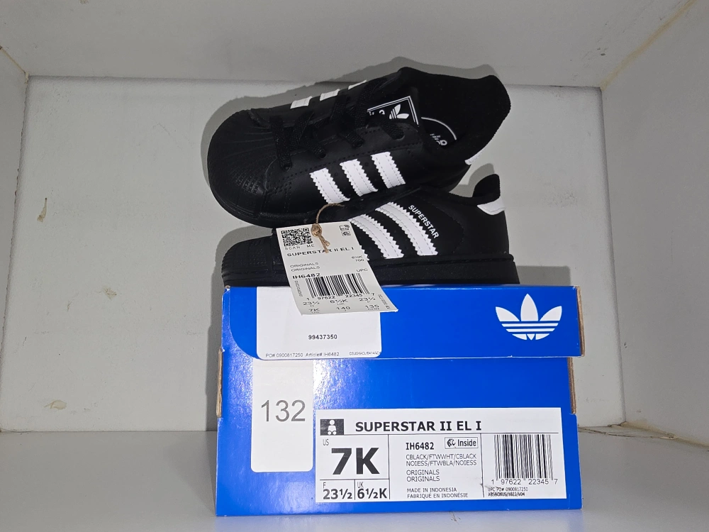 These Adidas Superstar II EL I sneakers are in new condition and come with the original box! They are black with white stripes and are a size 7K.