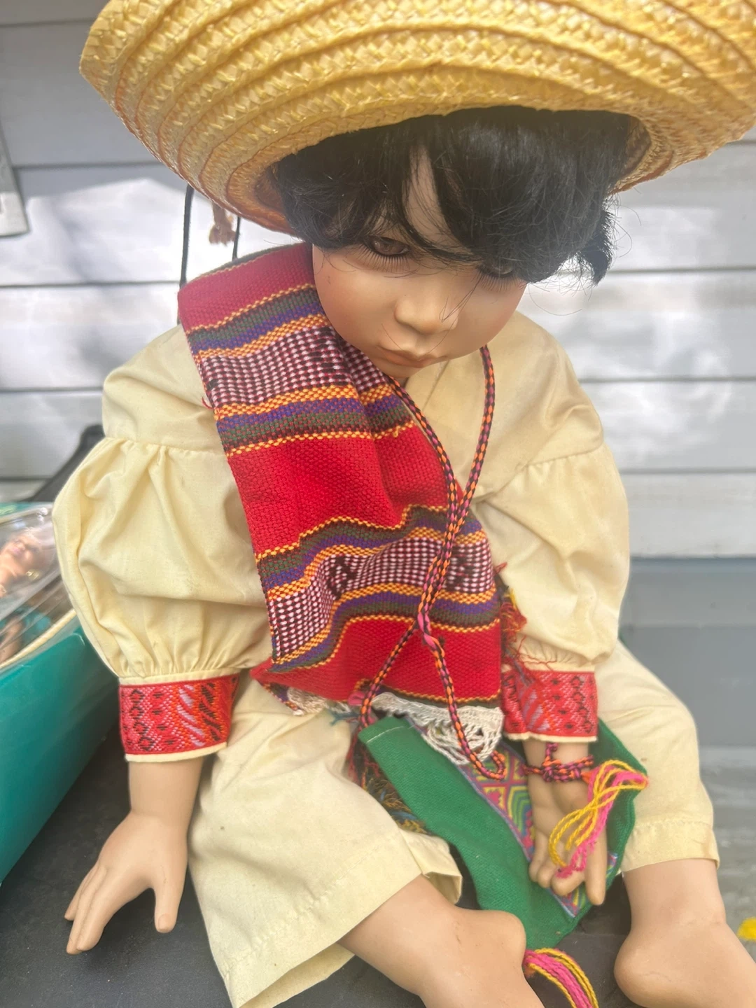 This is a charming collectible doll dressed in a traditional Mexican charro outfit, complete with a straw hat and colorful sash. It's in good condition and would make a lovely addition to any doll collection