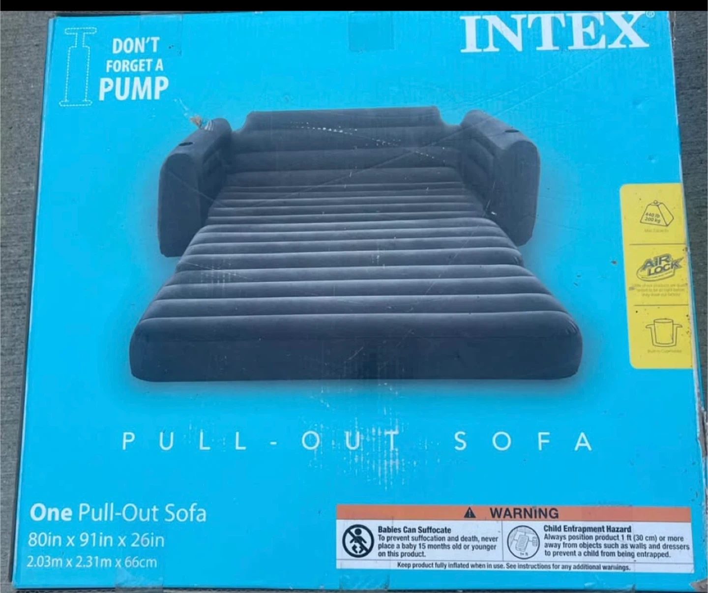 Selling an Intex pull-out sofa! It measures 80 inches by 91 inches by 26 inches. Perfect for extra seating or a comfy place to relax. Don't forget a pump!