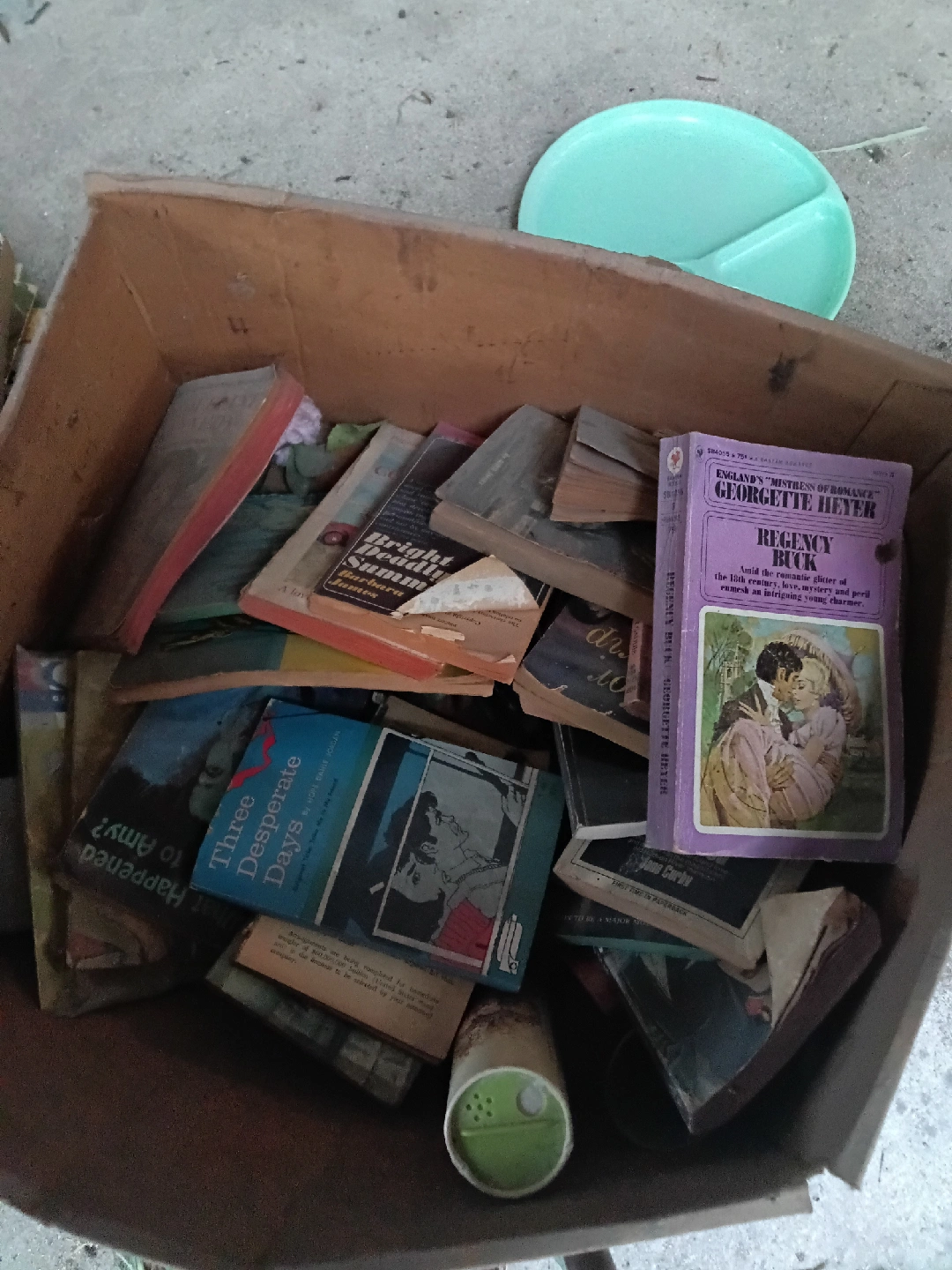 Selling a box of used books. Titles include "Three Desperate Days" by Hope Dahle Jordan, "Bright Deadly Summer" by Barbara, and "Regency Buck" by Georgette Heyer. Perfect for anyone looking to expand their reading collection