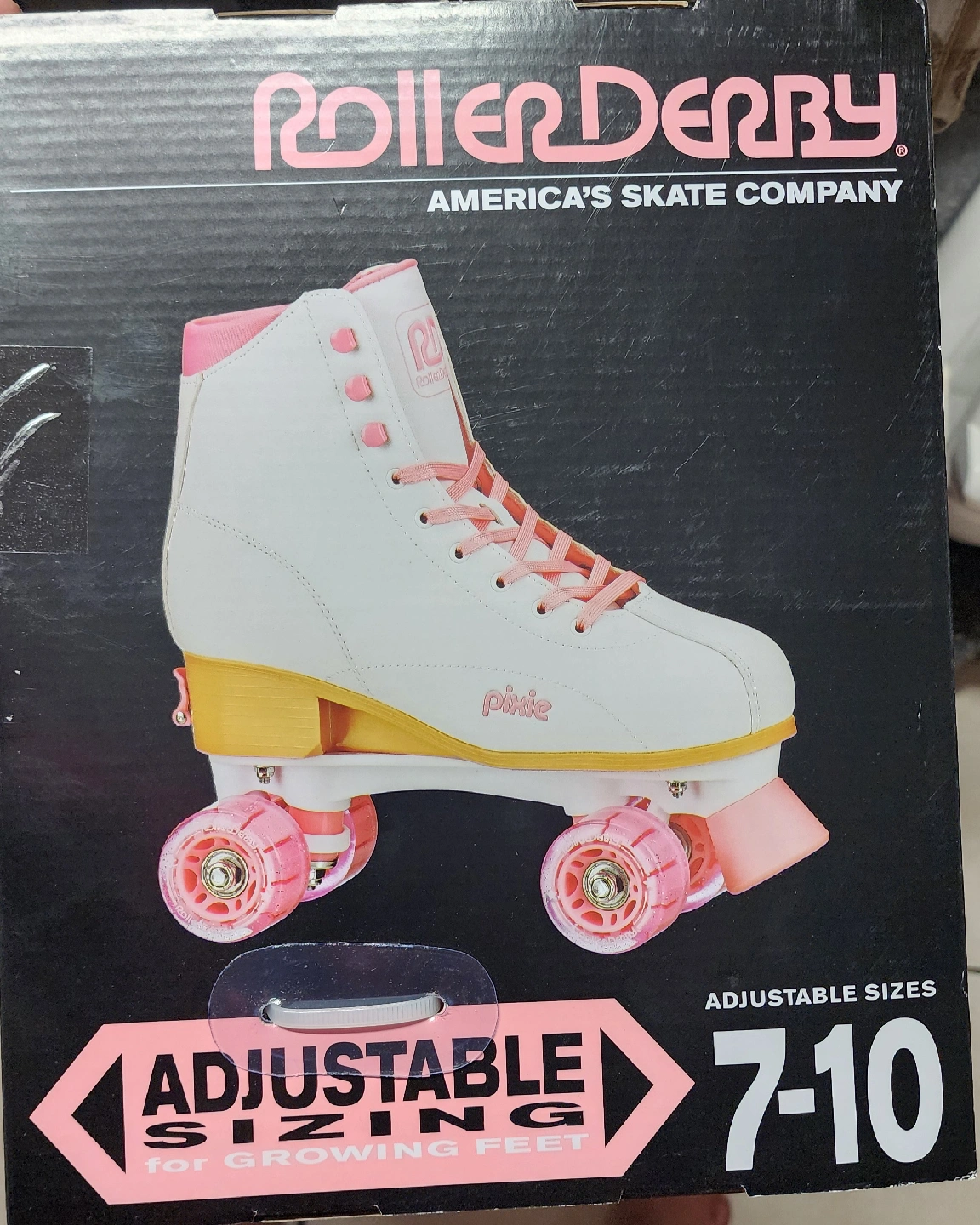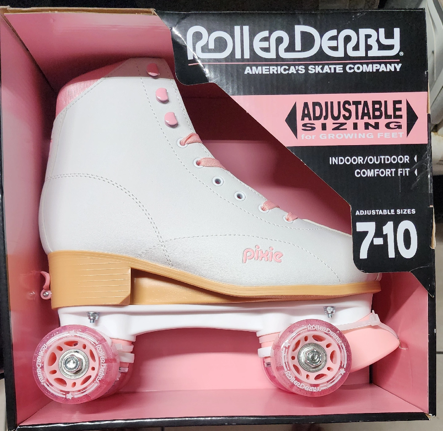 22These Roller Derby Pixie roller skates are adjustable and come in sizes 7-10! They're perfect for indoor or outdoor use and have a comfort fit. The box is included too