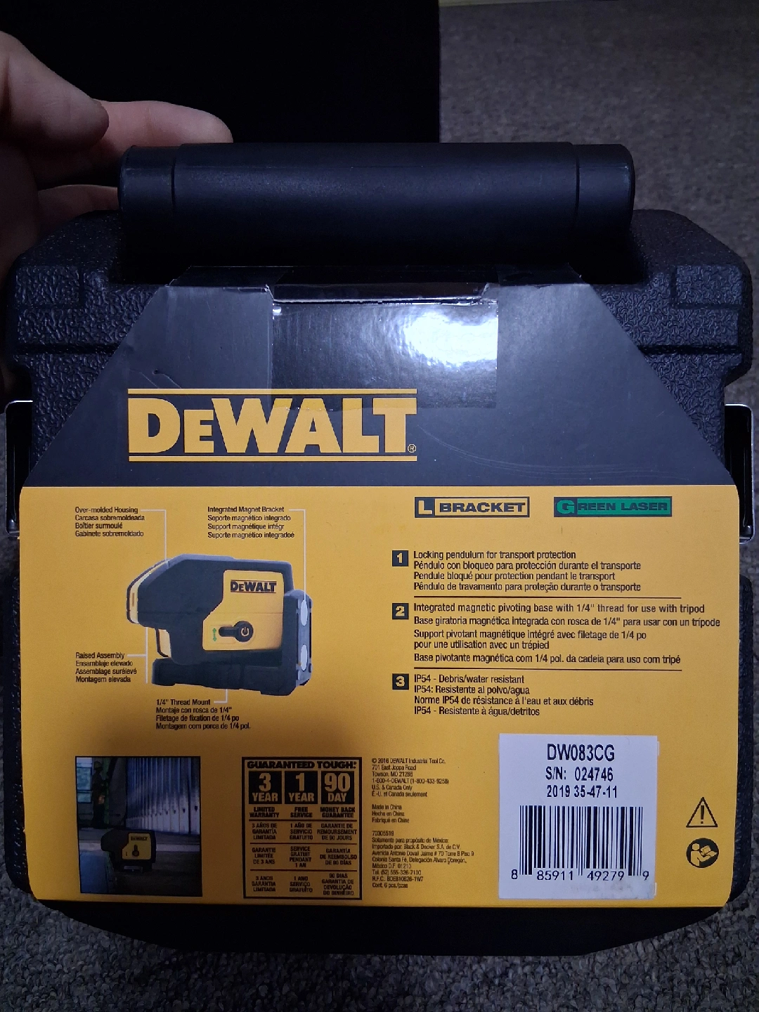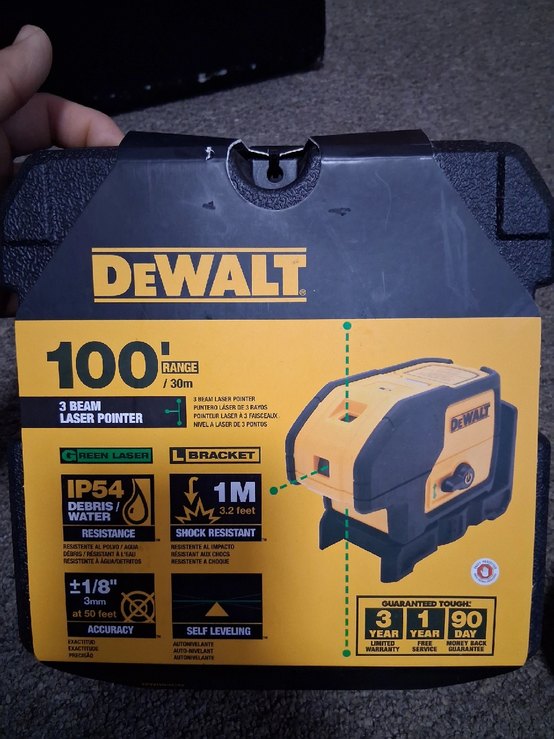 9Selling a DeWalt DW083CG 3-beam green laser pointer. It has a 100ft/30m range and is IP54 debris/water resistant. It's also shock resistant up to 1 meter (3.2 feet). The laser is self-leveling and has an accuracy of ±1/8" at 50 feet. Includes an L bracket and a case for protection during transport