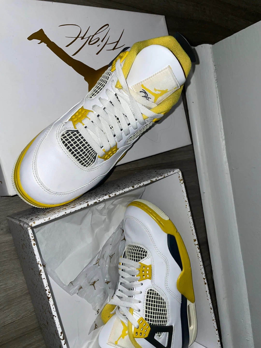 Selling a pair of Air Jordan 4 Retro in the Tour Yellow colorway! These are in great condition and come with the original box. A stylish addition to any sneaker collection