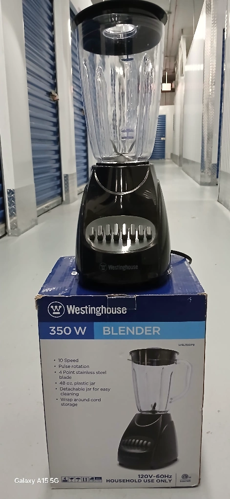 Selling a Westinghouse 350W blender. It comes with 10-speed settings and pulse rotation. The blender has a 4-point stainless steel blade and a 48 oz plastic jar. It's easy to clean with a detachable jar and includes wrap-around cord storage. The original box is included!