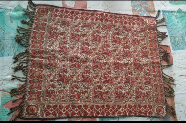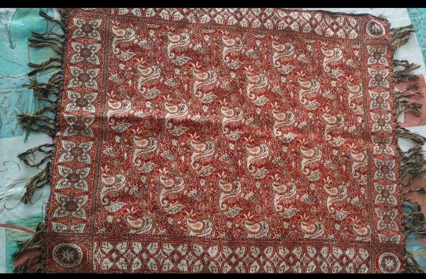 Add a touch of global charm to your dining experience with this used decorative table mat, showcasing a vibrant red paisley pattern and playful tassels. This unique piece brings an exotic flair to any table setting.