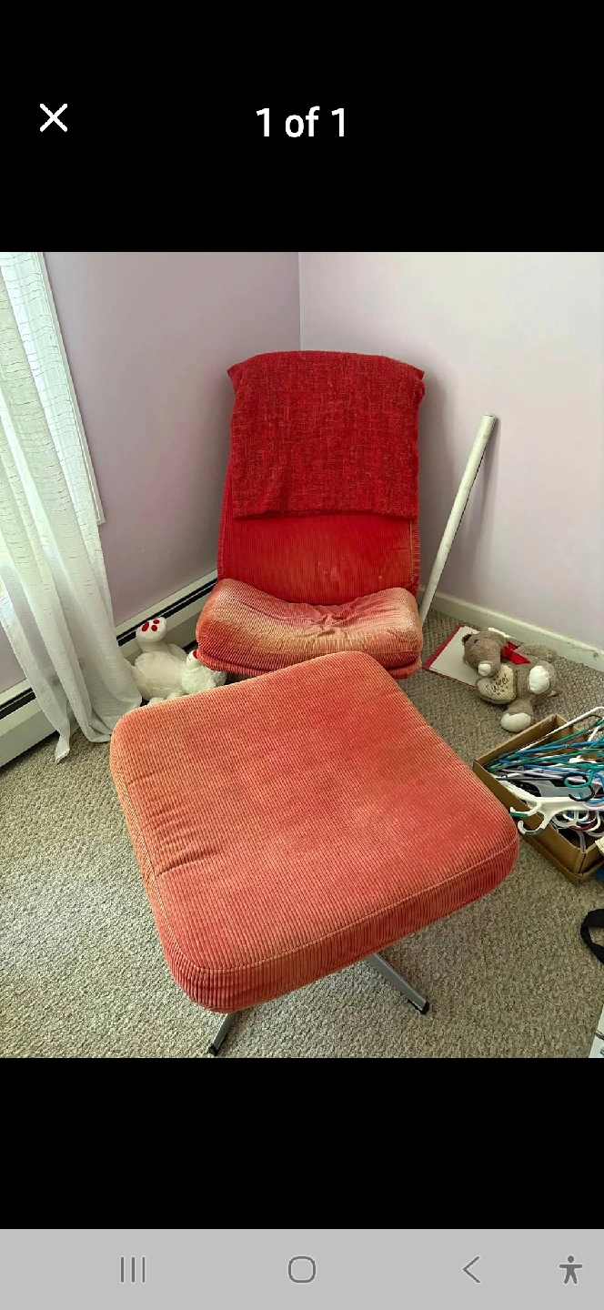 28Selling a vintage orange corduroy chair with a matching ottoman. The set shows some signs of wear, but is still comfortable and stylish. Perfect for adding a retro touch to your living space!