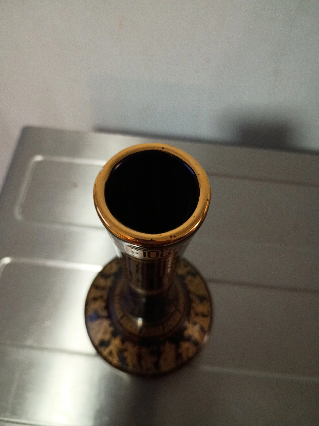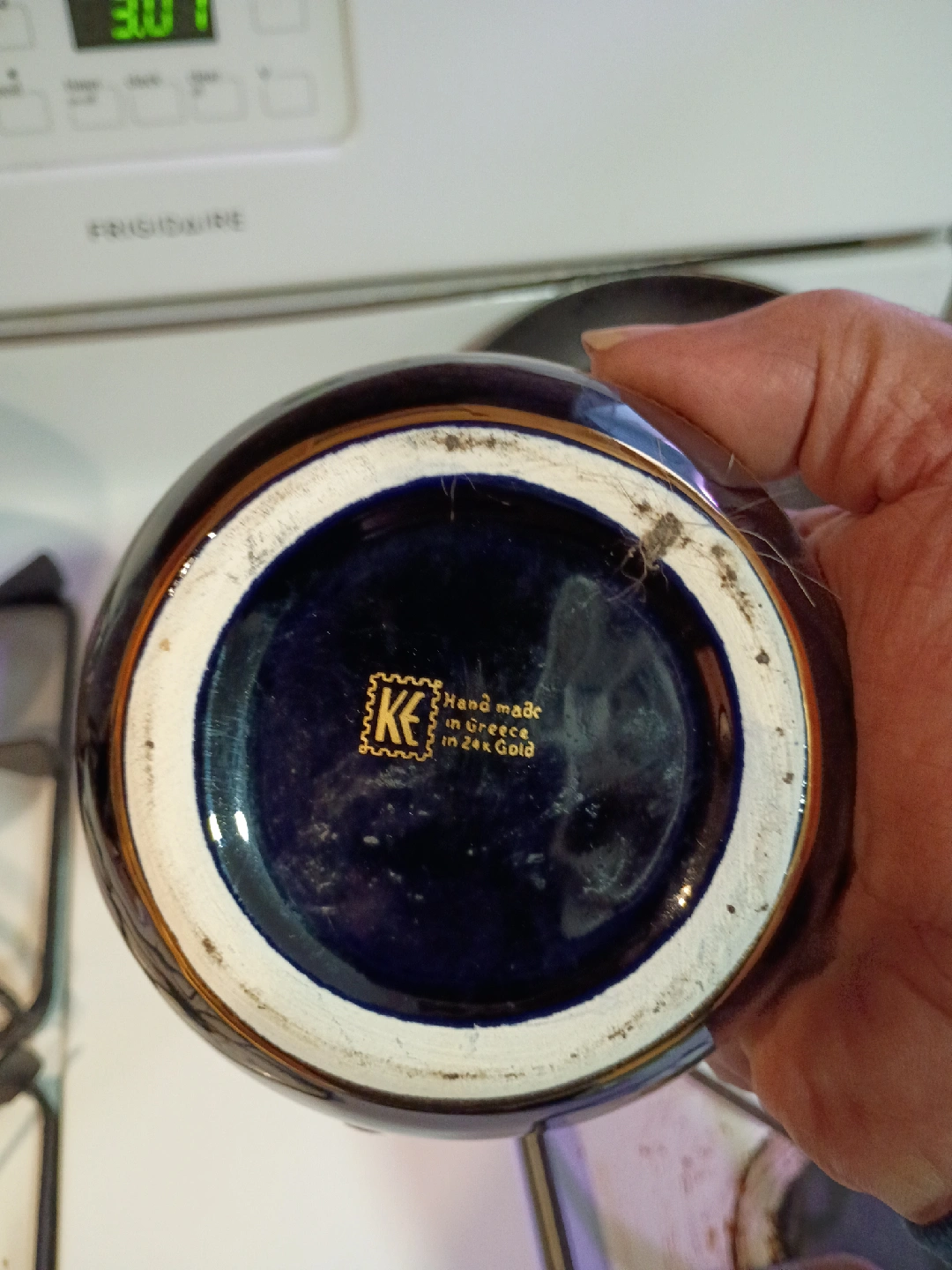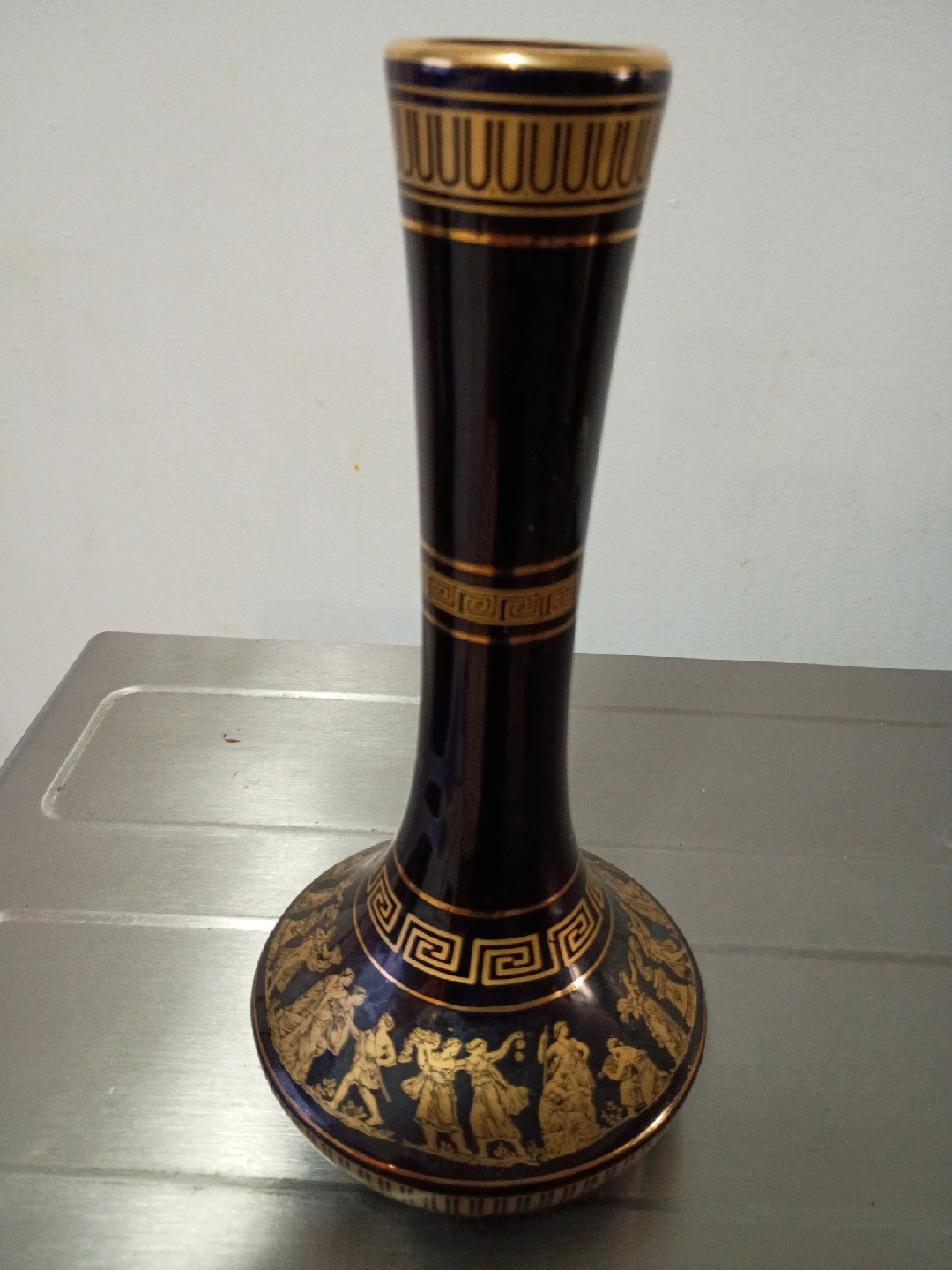 This is a beautiful vase, handmade in Greece with 24K gold accents. It features a classic Greek design in navy blue and gold.
