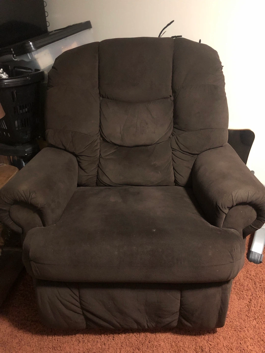 Comfortable brown recliner chair ready for a new home! It's a cozy spot to relax after a long day. There are some signs of use, but it's still in good condition and has lots of life left