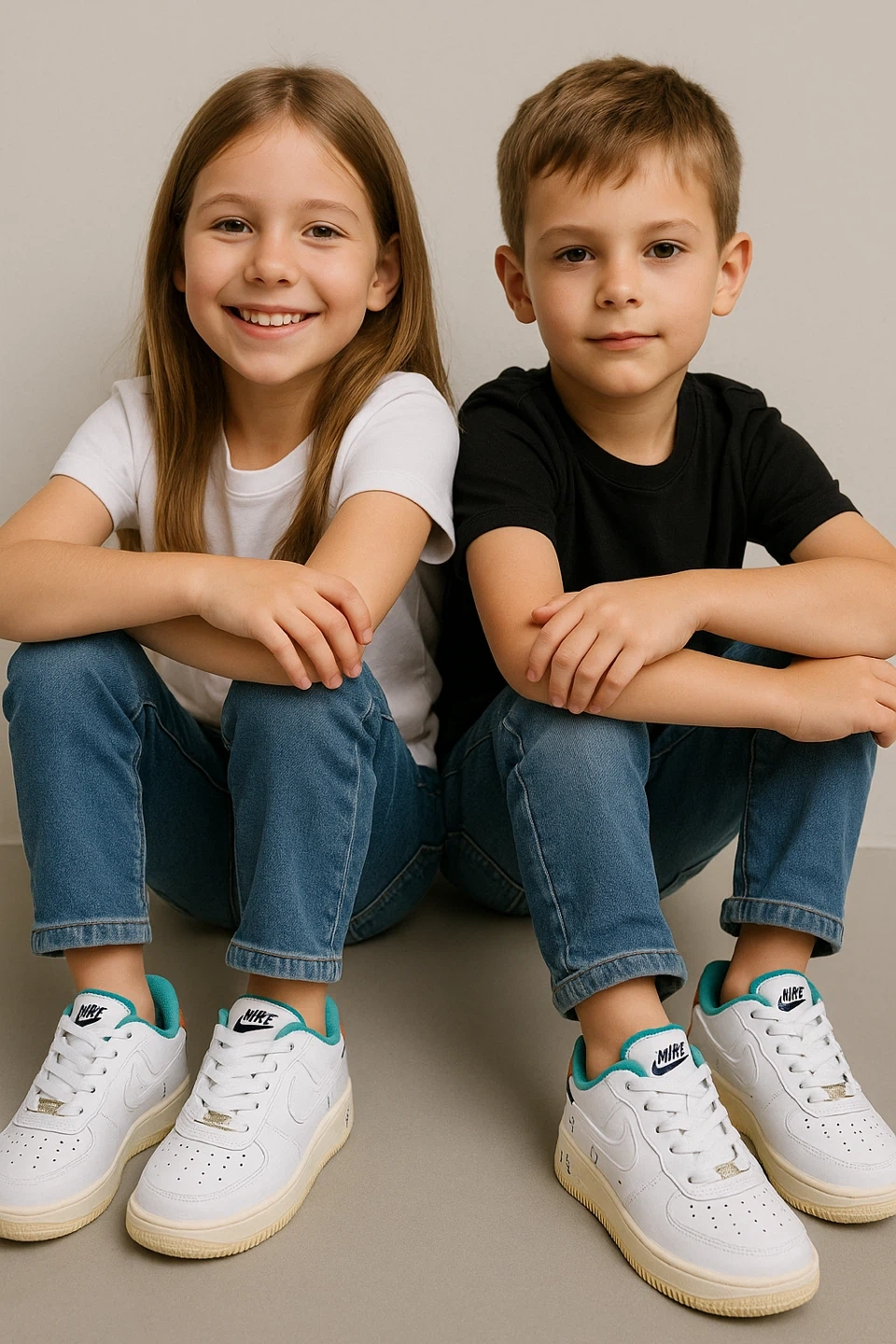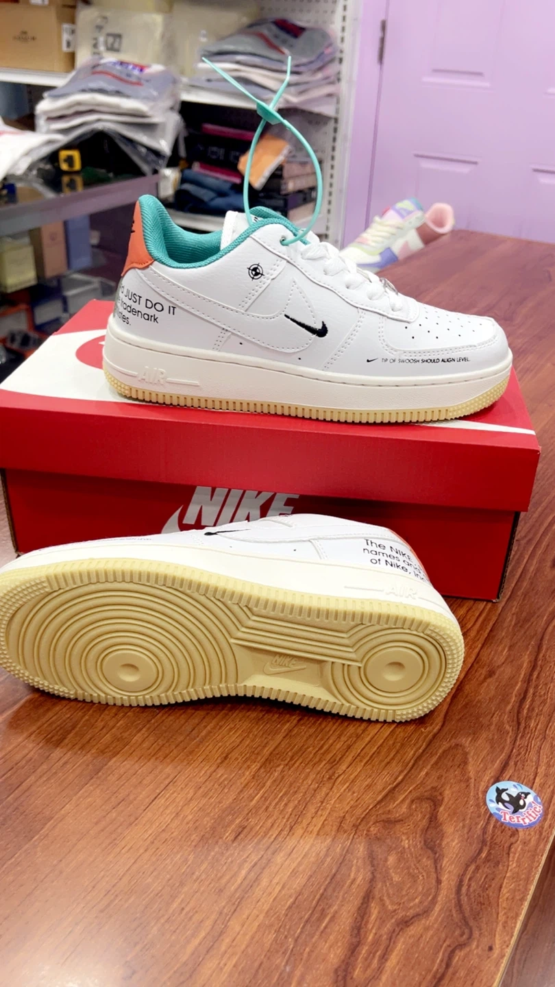 82Selling a pair of Nike Air Force 1 sneakers in white. They feature a turquoise lining and orange/black accent on the heel. and come with the original box! In size for big kids boys 4 for girls 5.5