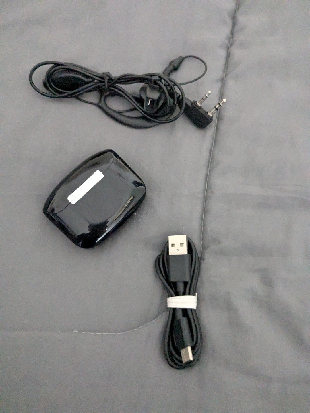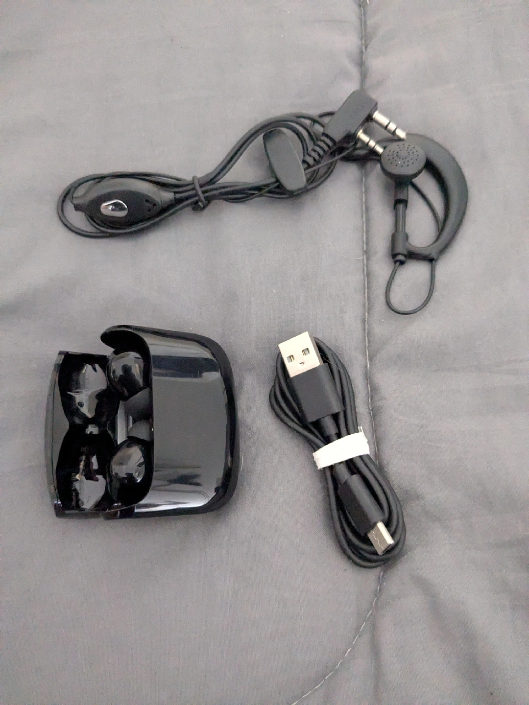 Selling a set of black wireless earbuds. They come with a charging case and a USB cable. Perfect for listening to music or podcasts on the go!