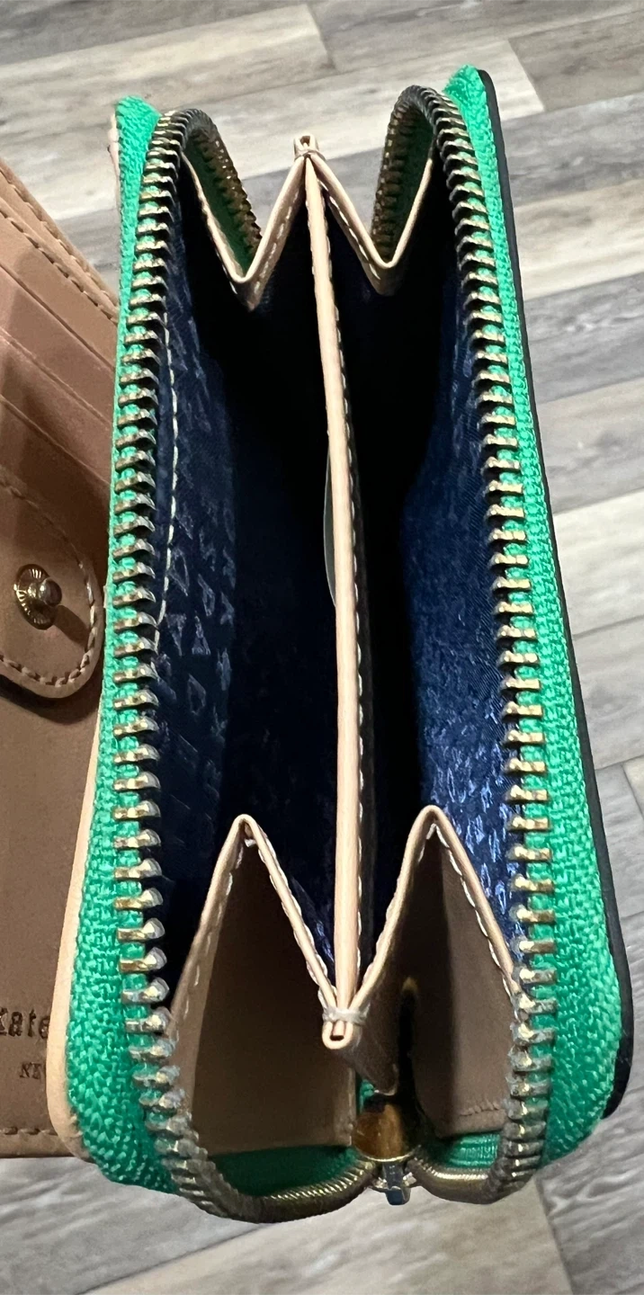 This is a Kate Spade wallet in a bright green color. It's made of leather and has a zip-around closure. The wallet features several card slots and compartments for organizing your essentials. The size is approximately 4.5 inches wide.