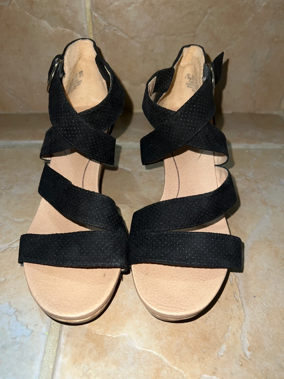 Selling a pair of Dr. Scholl's wedge sandals in black. They are a size 7.5. These sandals feature a stylish cross strap design and a comfortable wedge heel. Perfect for adding a bit of height while still being comfortable