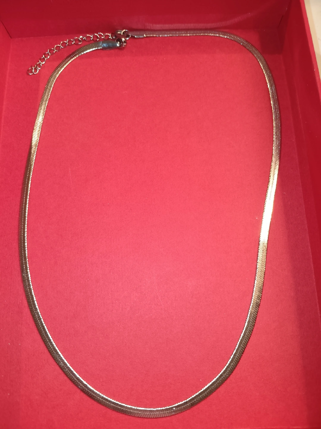 754Selling a beautiful herringbone stainless steel chain necklace! It's in great condition and comes in a red box. The necklace is silver in color.