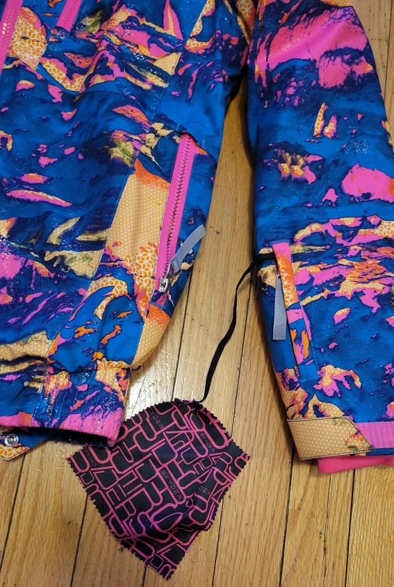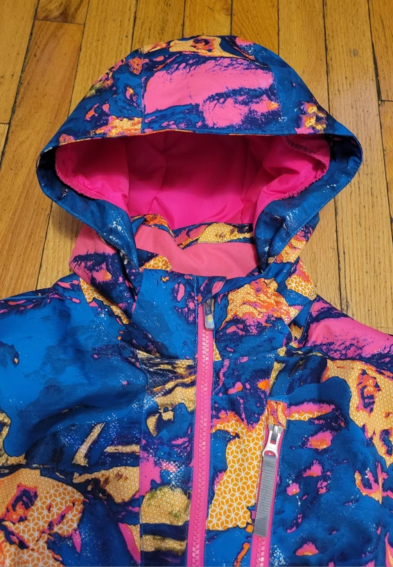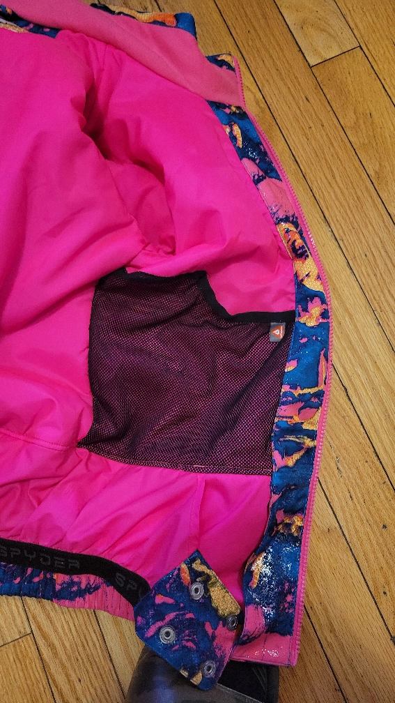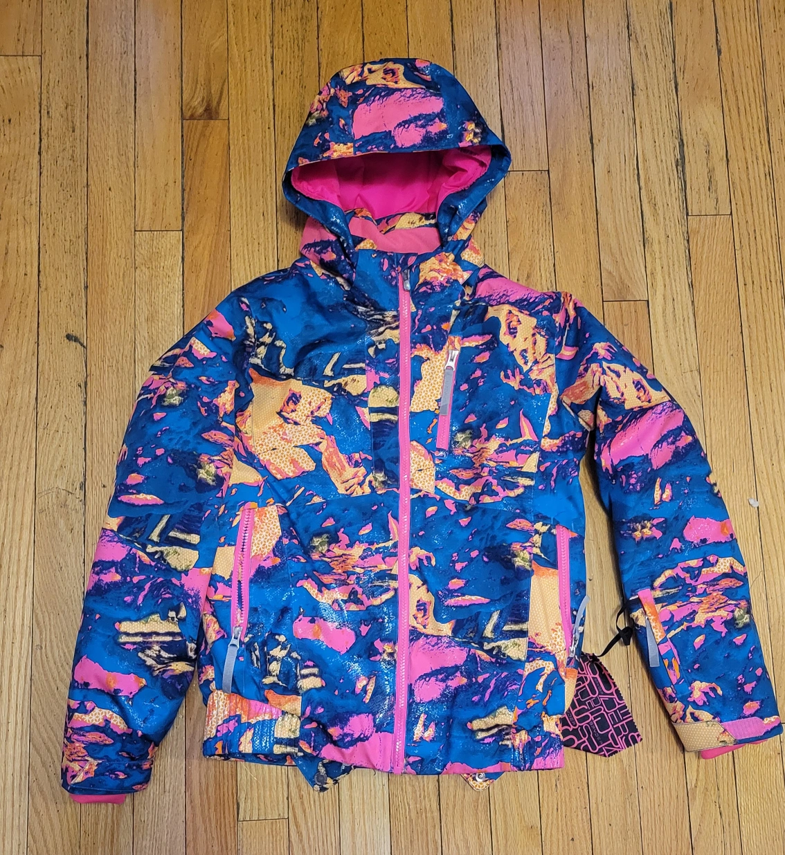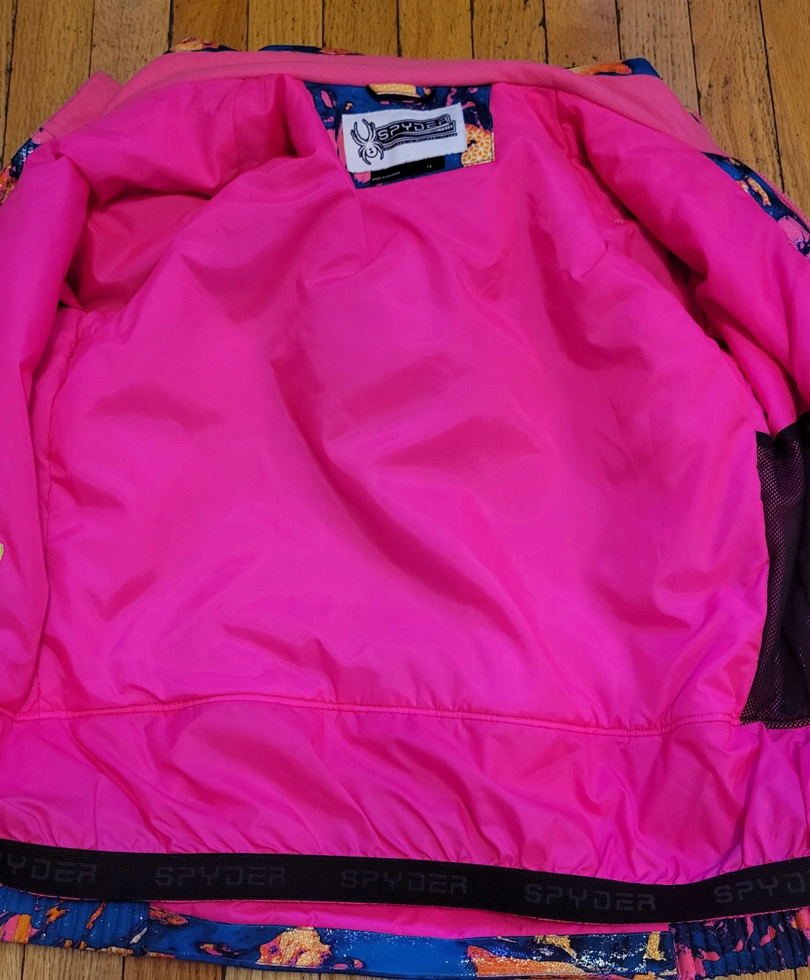 511Selling a Spyder girls' ski jacket, size 16. It features a vibrant blue, pink, and orange pattern with a bright pink lining. Perfect for hitting the slopes! The jacket is in great condition.