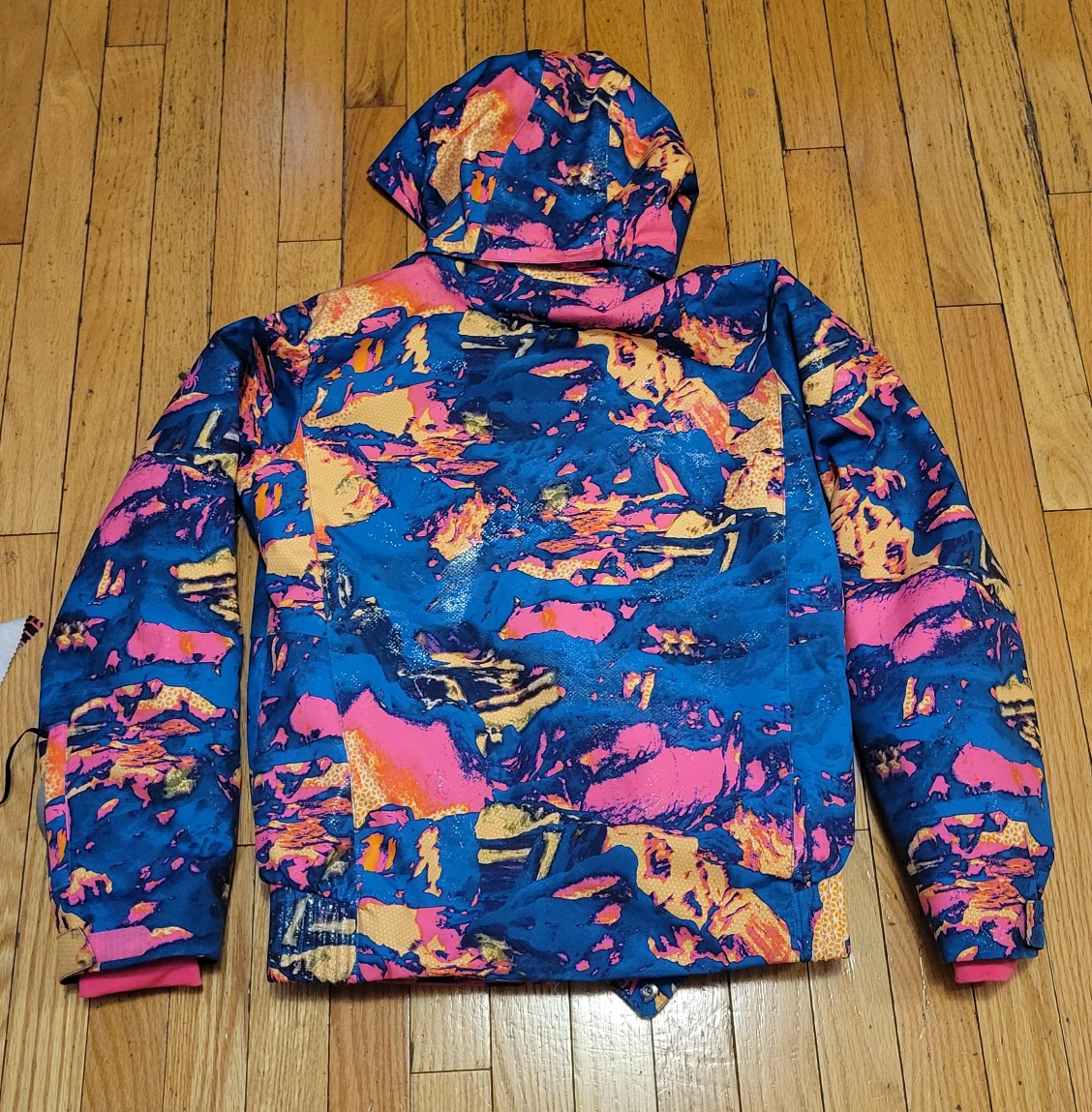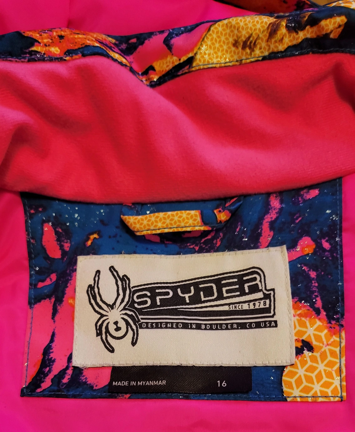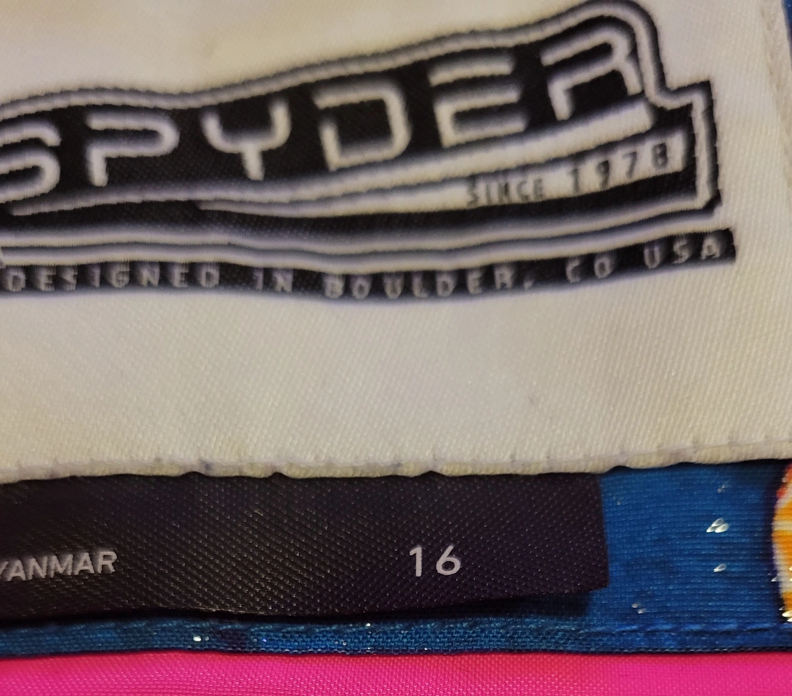 511Selling a Spyder girls' ski jacket, size 16. It features a vibrant blue, pink, and orange pattern with a bright pink lining. Perfect for hitting the slopes! The jacket is in great condition.