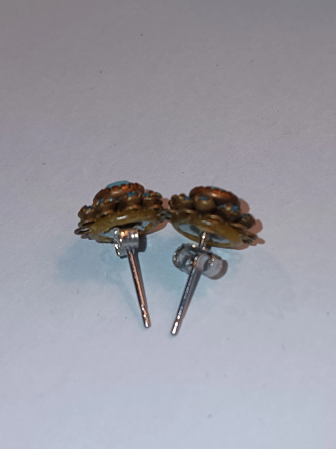 Selling a pair of vintage turquoise flower earrings! They have a lovely floral design with turquoise-colored stones. These earrings would make a great addition to any jewelry collection!