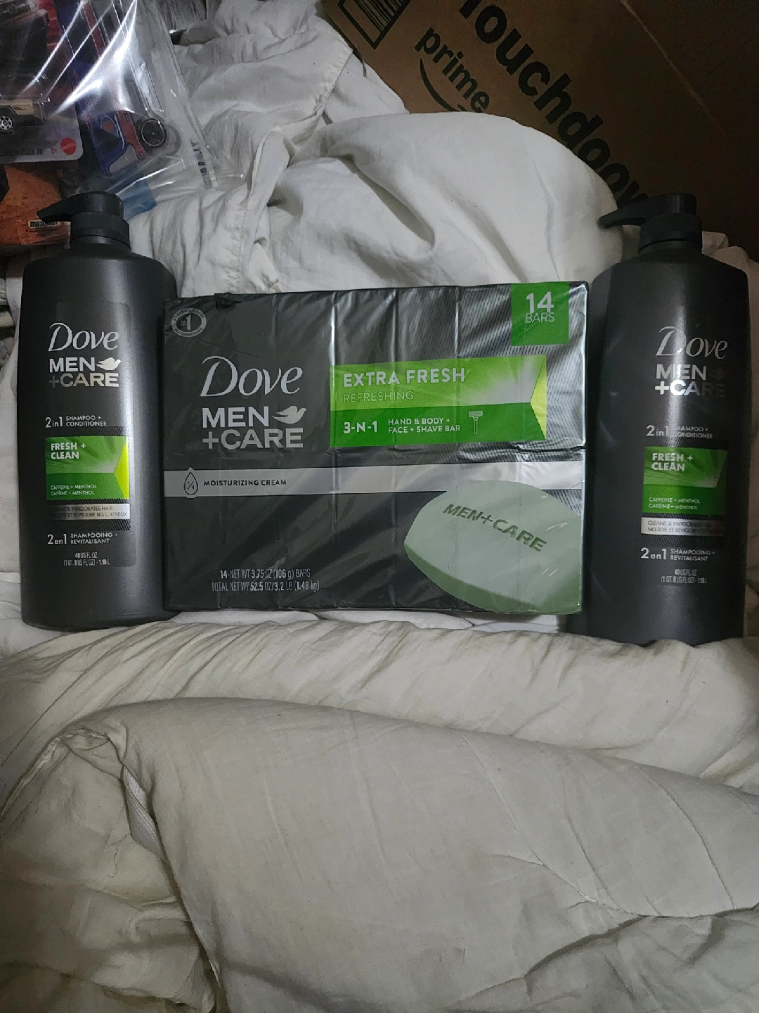 I have a set of Dove Men+Care products for sale! It includes two bottles of 2-in-1 shampoo and conditioner in the Fresh + Clean scent, and a 14-bar pack of Extra Fresh 3-in-1 hand, body, face, and shave bar soap. Perfect for stocking up on your grooming essentials