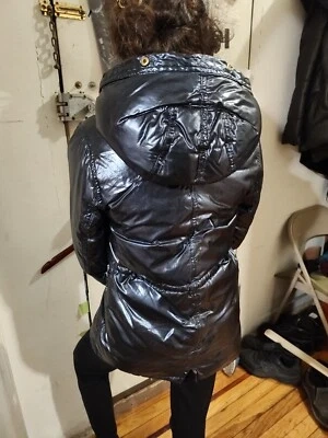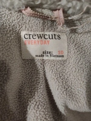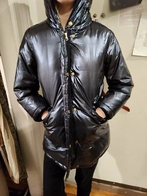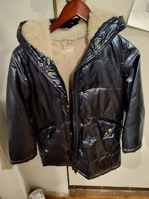 10GIRL´S J. CREW CREWCUTS METALLIC PUFFER COAT size 10 Here's a shiny black puffer jacket with a hood. It features gold-colored buttons and a soft, furry lining inside the hood and around the collar. Perfect for staying warm and stylish!