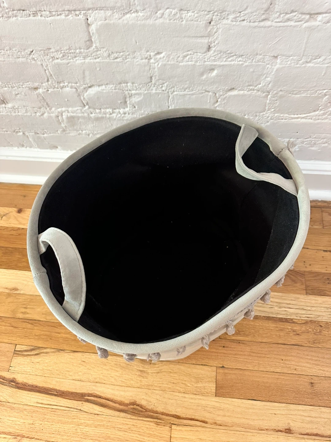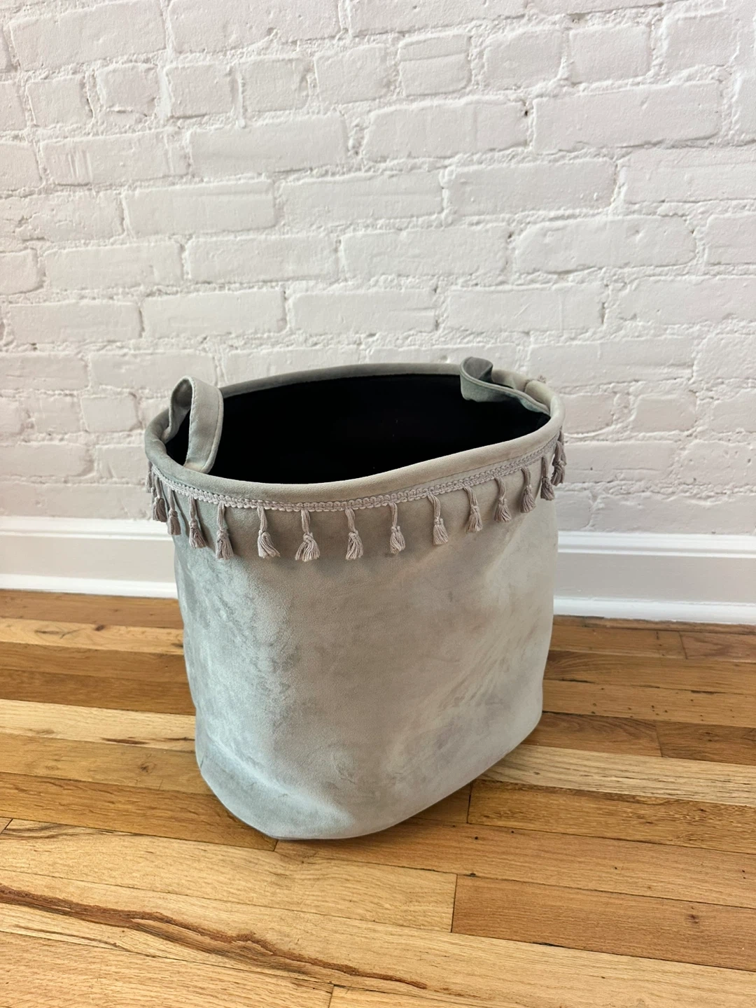 This is a cute storage basket made of a soft, gray suede material. It features a stylish tassel trim around the top edge. Perfect for organizing toys, blankets, or other household items!