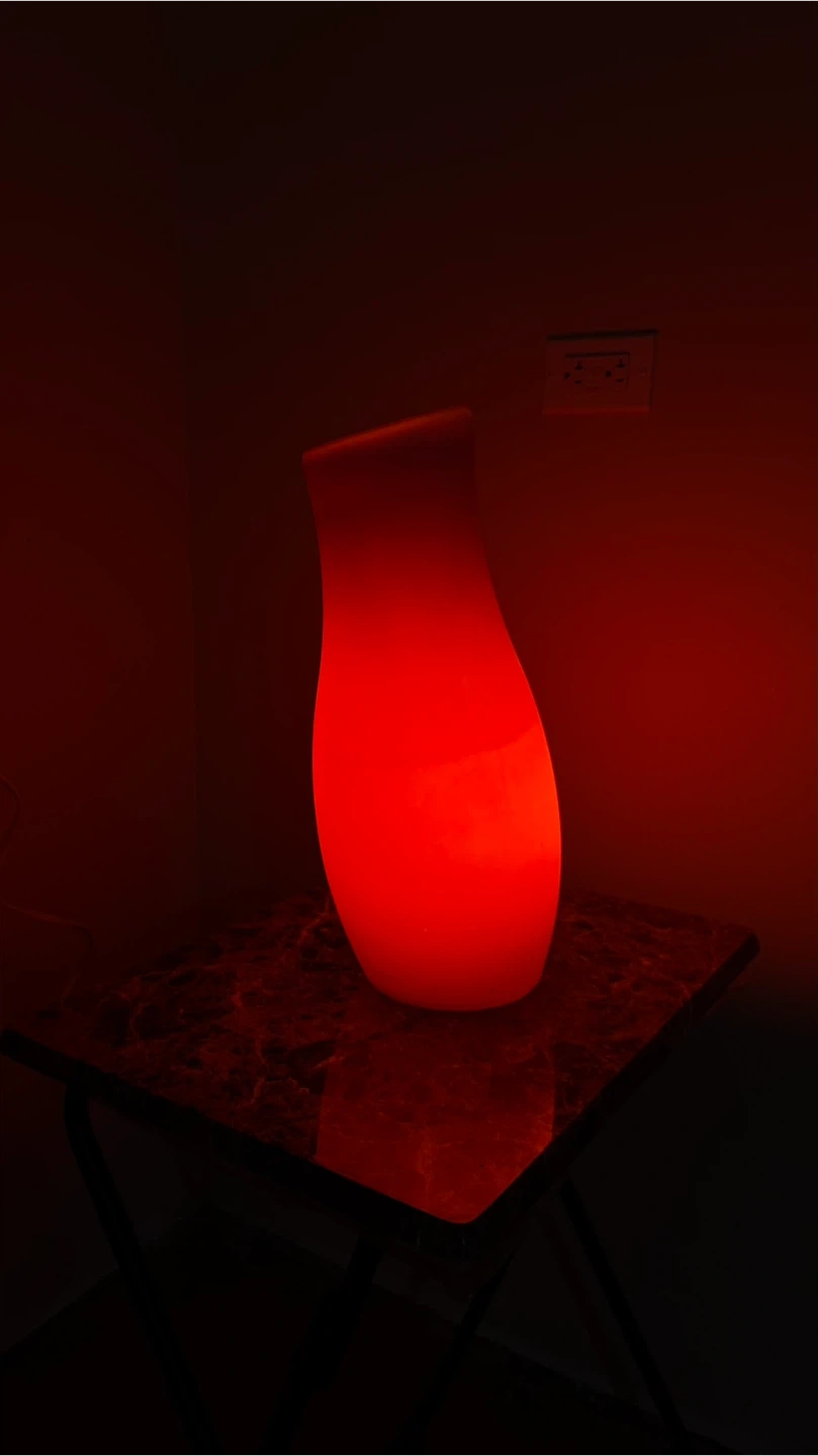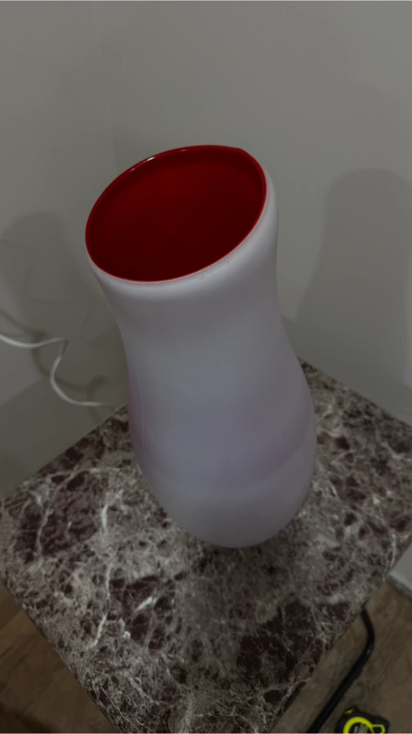 70This is a sleek accent table lamp, perfect for adding a modern touch to any room. It features a white exterior with a vibrant red interior, creating a soft and inviting glow when lit. It's in great condition and ready to brighten up your space! Glass