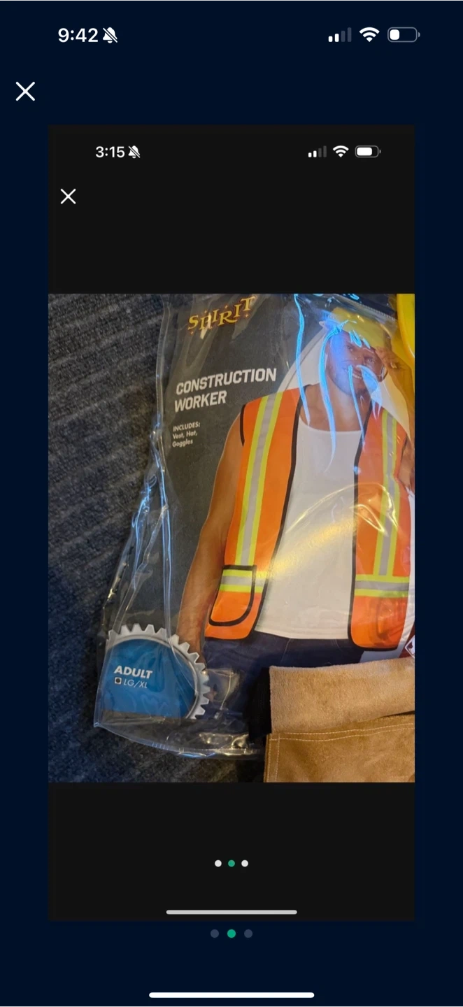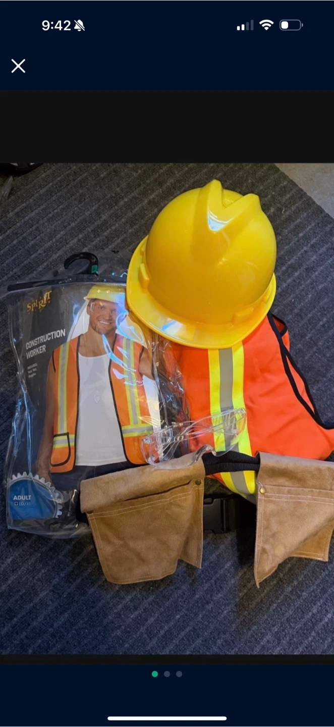 10Selling a Spirit Halloween Construction Worker Costume. It includes a vest, hard hat, goggles, and tool belt. The size is Adult OS/XL.