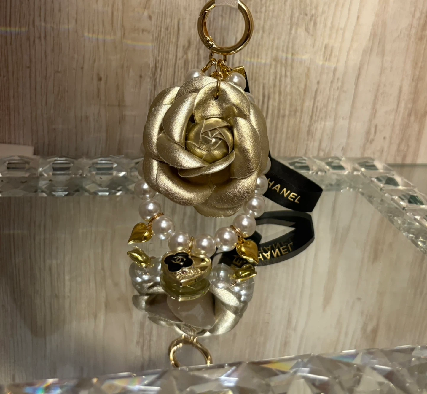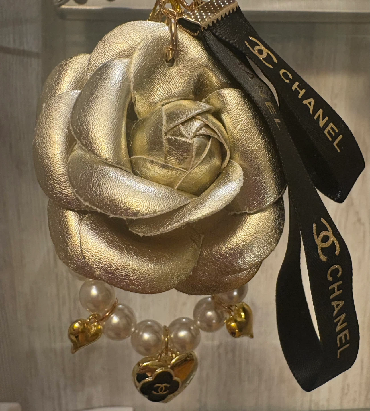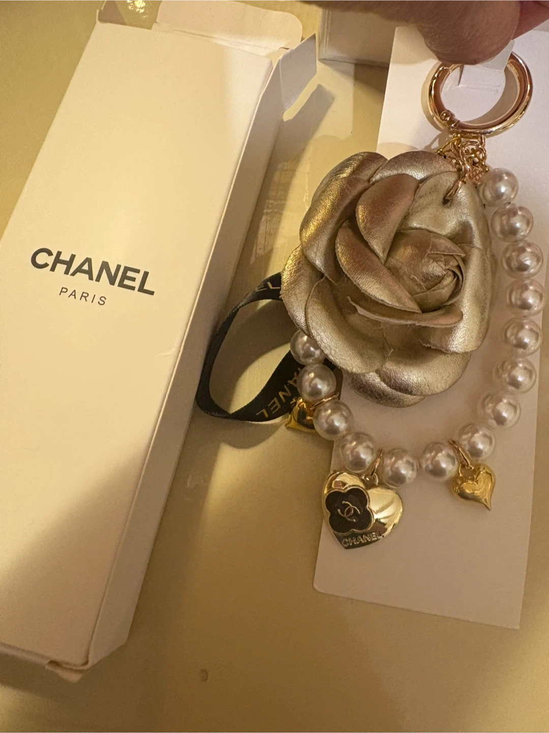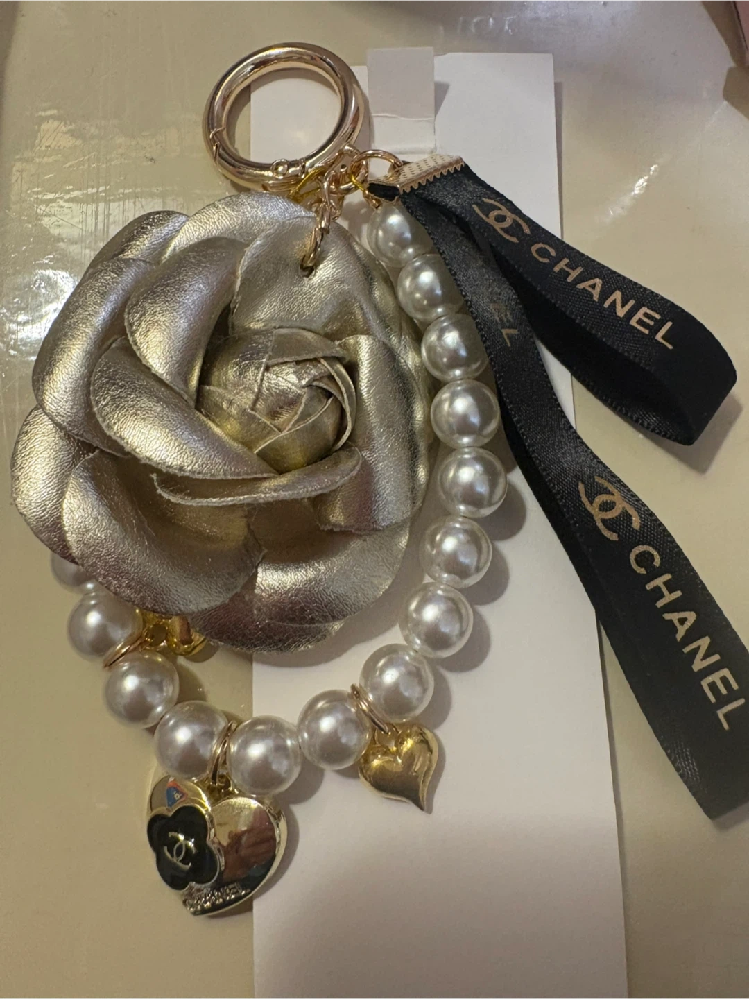 Selling a Chanel key charm featuring a gold flower and pearl accents. It comes with its original box and Chanel ribbon. This beautiful accessory adds a touch of elegance to any bag or set of keys