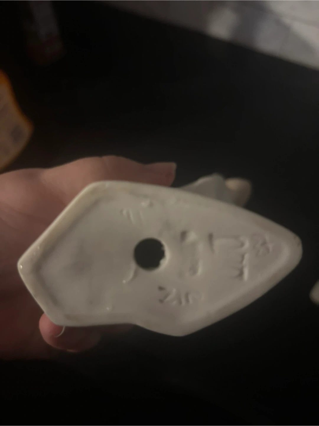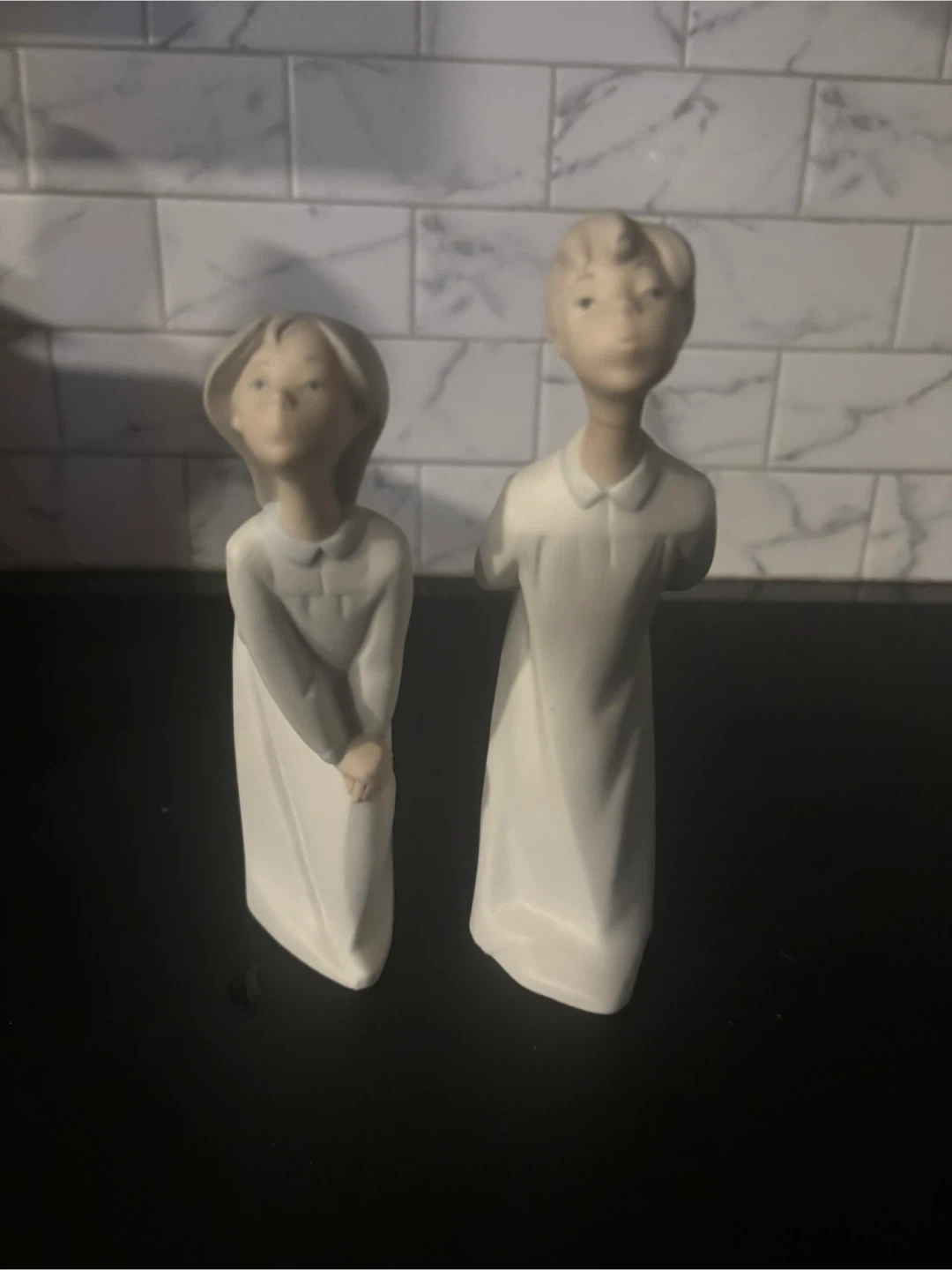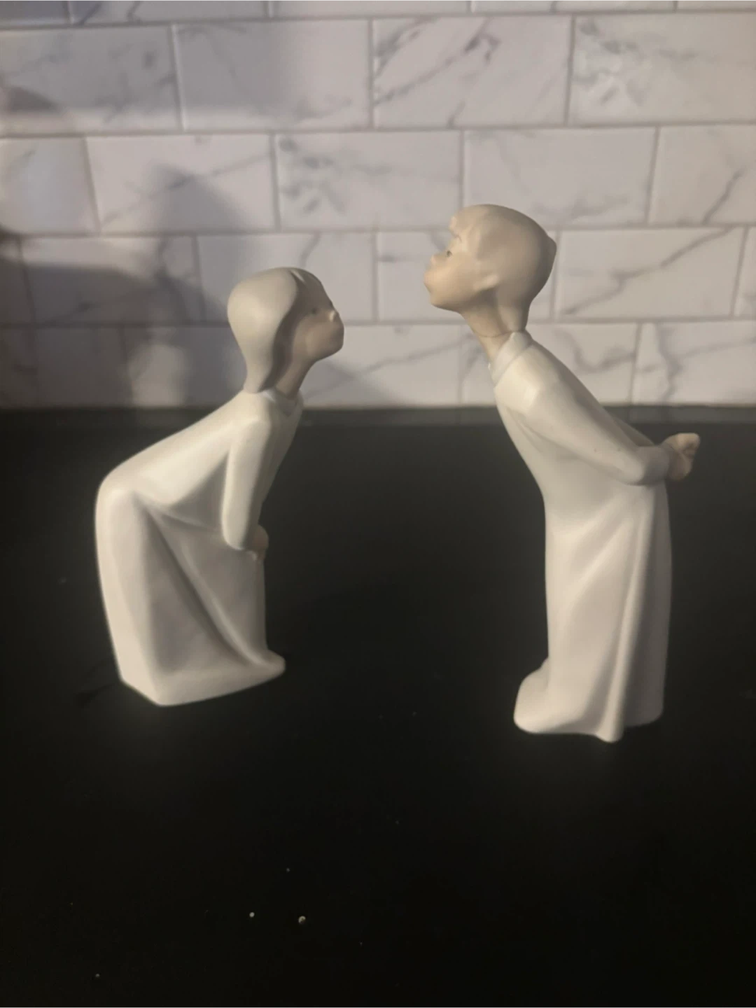 These are a set of vintage Otagiri Japan figurines depicting a boy and girl about to kiss. They are made of a white material and have a minimalist design. There are markings on the bottom that say "Otagiri Japan" and "93" indicating they were likely made in 1993